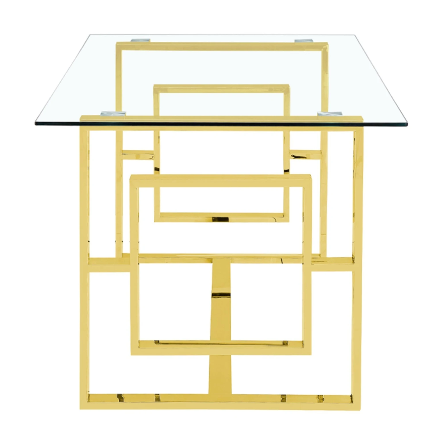 The Apex Gold Metal Dining Table comes with a simplistic design that will make a statement in your dining room. With a steel gold effect frame at each end in the shape of a geometric square pattern, the table is topped with a sleek glass top. The table will compliment classic and modern furniture, style with your own choice of dining chairs to fit in with your interiors seamlessly.