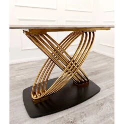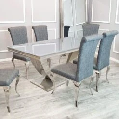 Bringing the glam to your dining room the stunning designed Arial 1.8 m Pandora Marble Dining Table featuring a polished stainless steel swooping base making a statement in your home. The table is topped with a incredibly hardwearing and scratch resistant pandora marble top. The table comes with sleek lines and smooth materials adding elegance and making it easy to clean for a busy family. The dining table seats up to 8 people and can be displayed with your own choice of dining chairs.