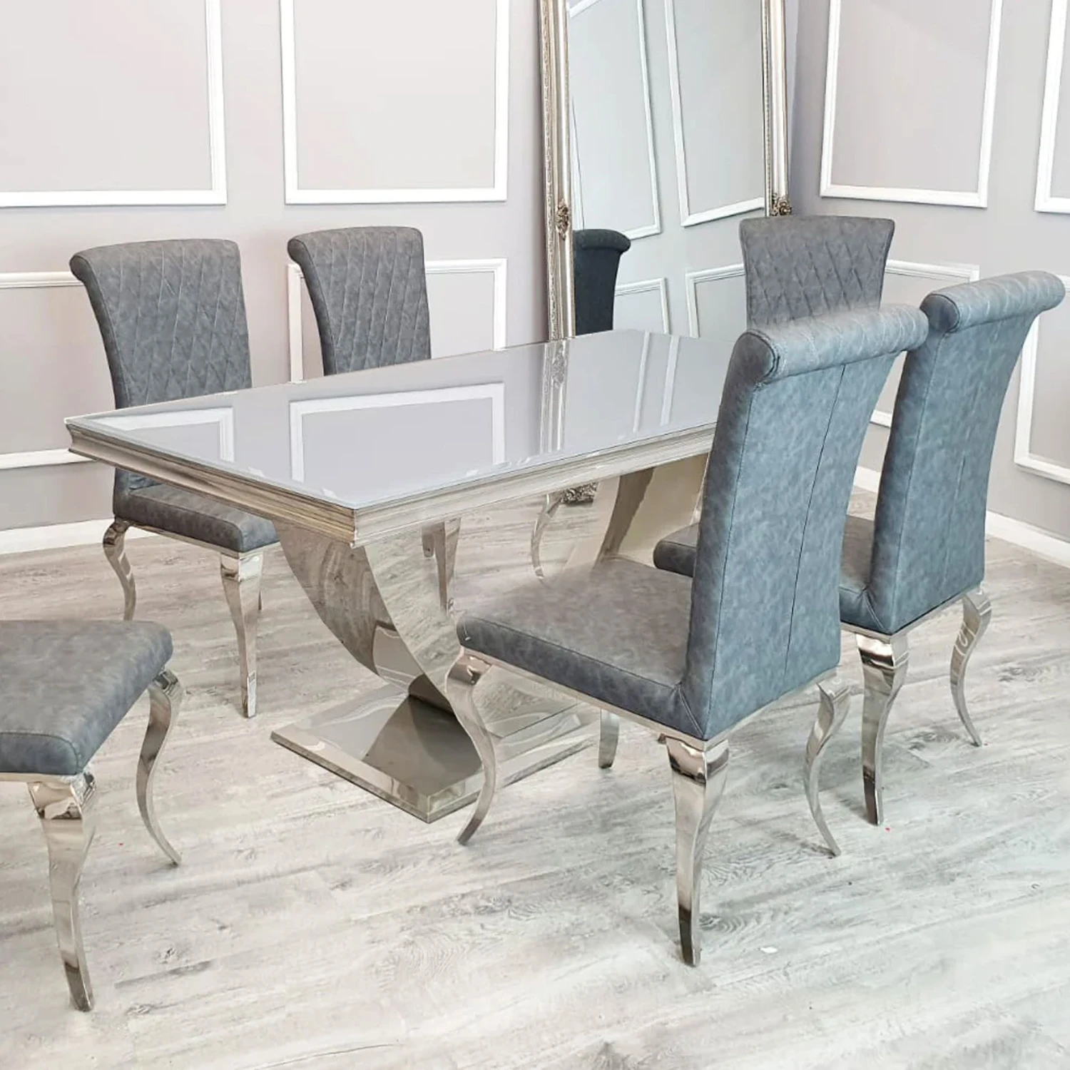 Adding a luxurious design with this Arial White Glass 2 m Dining Table featuring a polished stainless steel swooping base adding a real statement in your dining room. The top of the table features a luxury white glass top made hardwearing and scratch resistant. The table comes with sleek lines and smooth materials adding elegance and making it easy to clean for a busy family. Display the dining table with your own choice of dining chair to suit your interiors, the table will seat up to 8 people.
