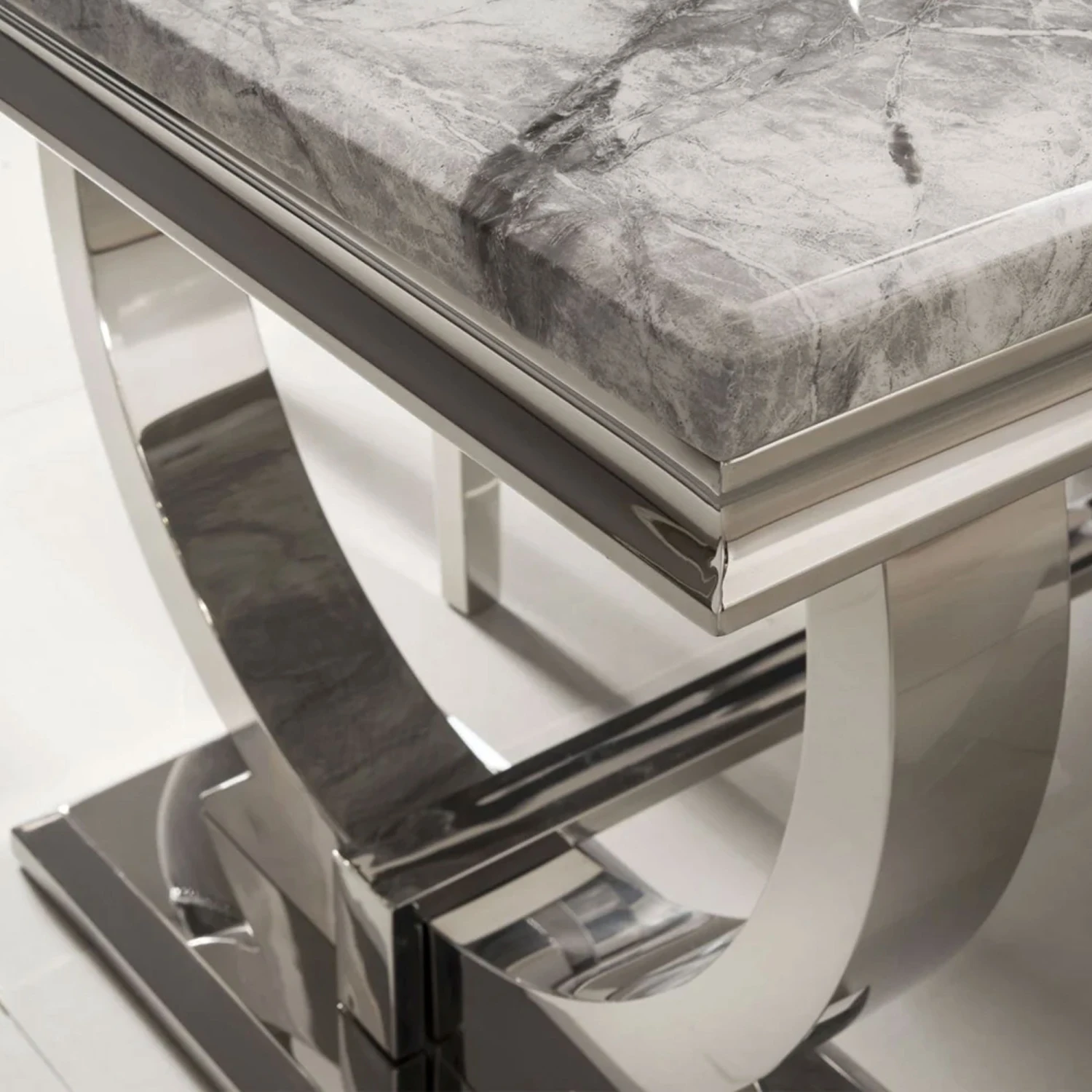 The Arriana White Marble 1.8 m Dining Table comes in a luxurious design with polished stainless steel circular legs adding a real statement in your dining room. The top of the table features a luxury White marble top made hardwearing and scratch resistant. The table comes with sleek lines and smooth materials adding elegance and making it easy to clean for a busy family. The dining table seats up to 8 people and can be displayed with your own choice of dining chairs or benches.