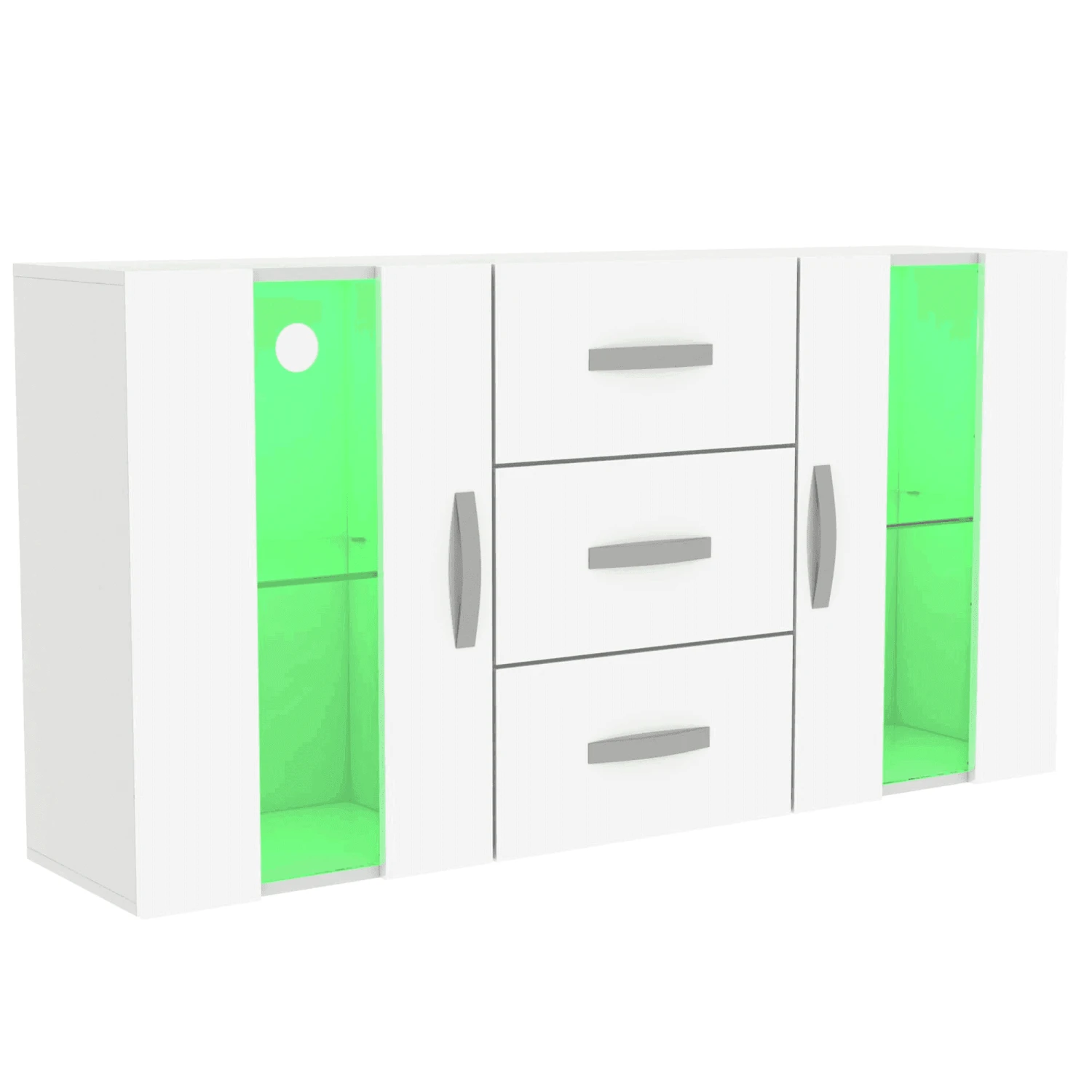 Looking to upgrade your home? Why not get this Astro 2 Door 3 Drawer White LED Sideboard. Set in a beautiful white high gloss and featuring fancy LED lights, this is sure to spruce up the decor. This Astro sideboard has 2 doors on either side with an internal shelf to equip you with more space for your household items with 3 drawers in the middle. With ample storage, this is perfect when you need extra. The doors on either side have a glass panel running through the middle which adds to the overall detail of this sideboard, showing a modern, stylish look. The LED lights have a remote included so that you can play around with the colours, sure to keep the children entertained!