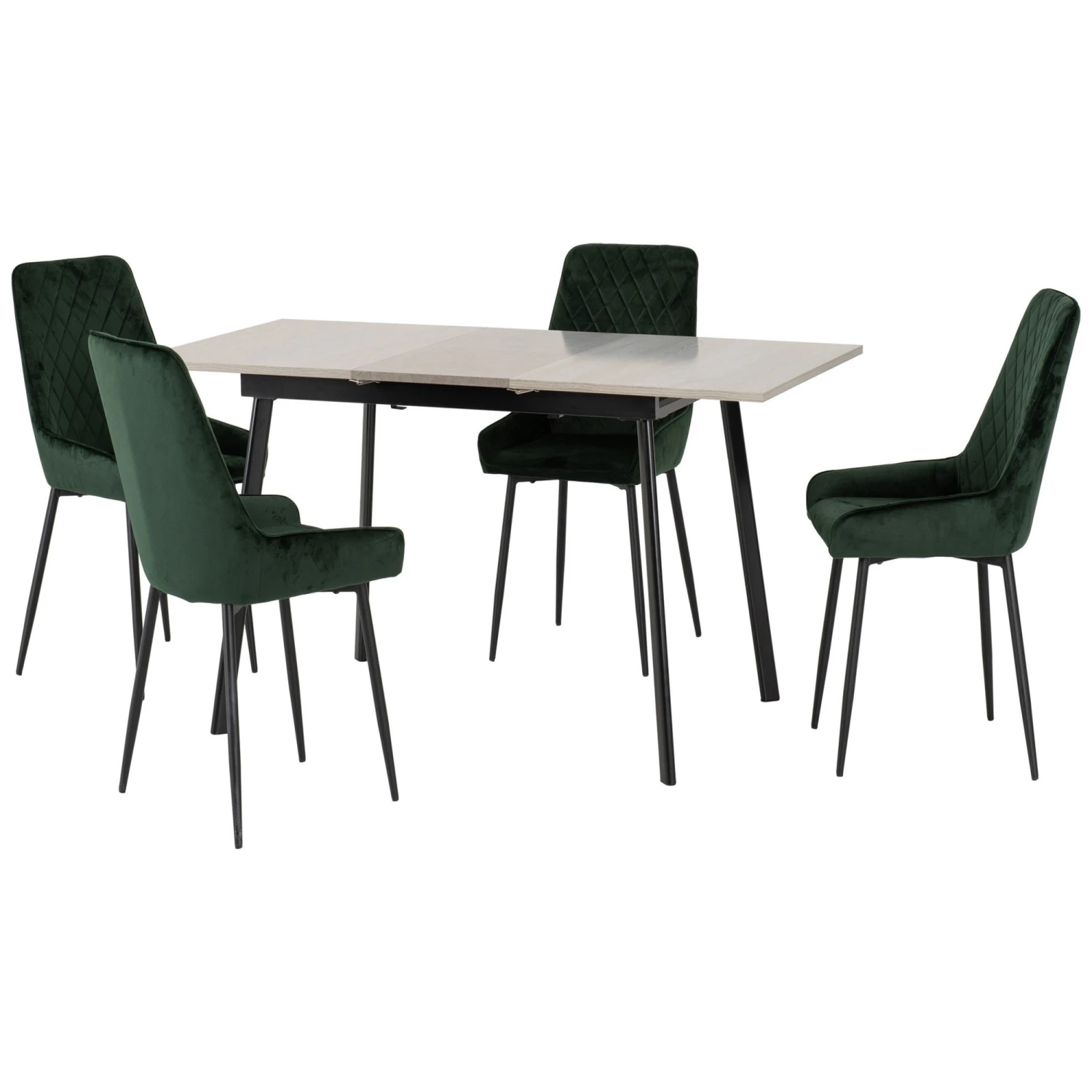 Love hosting social gatherings but don’t have enough space around the dinner table? Why not introduce this Avery Concrete & Grey Oak Extending Dining Set with Emerald Green Avery Chairs and extend it out when inviting extra over for dinner. With a middle extendable feature that provides additional tabletop space, it comes in a concrete effect and grey oak finish. Complete with 4 vibrant emerald green chairs that are comfortable and stylish with a quilted design, this dining set is certain to stand out, making an impressive addition to your home.