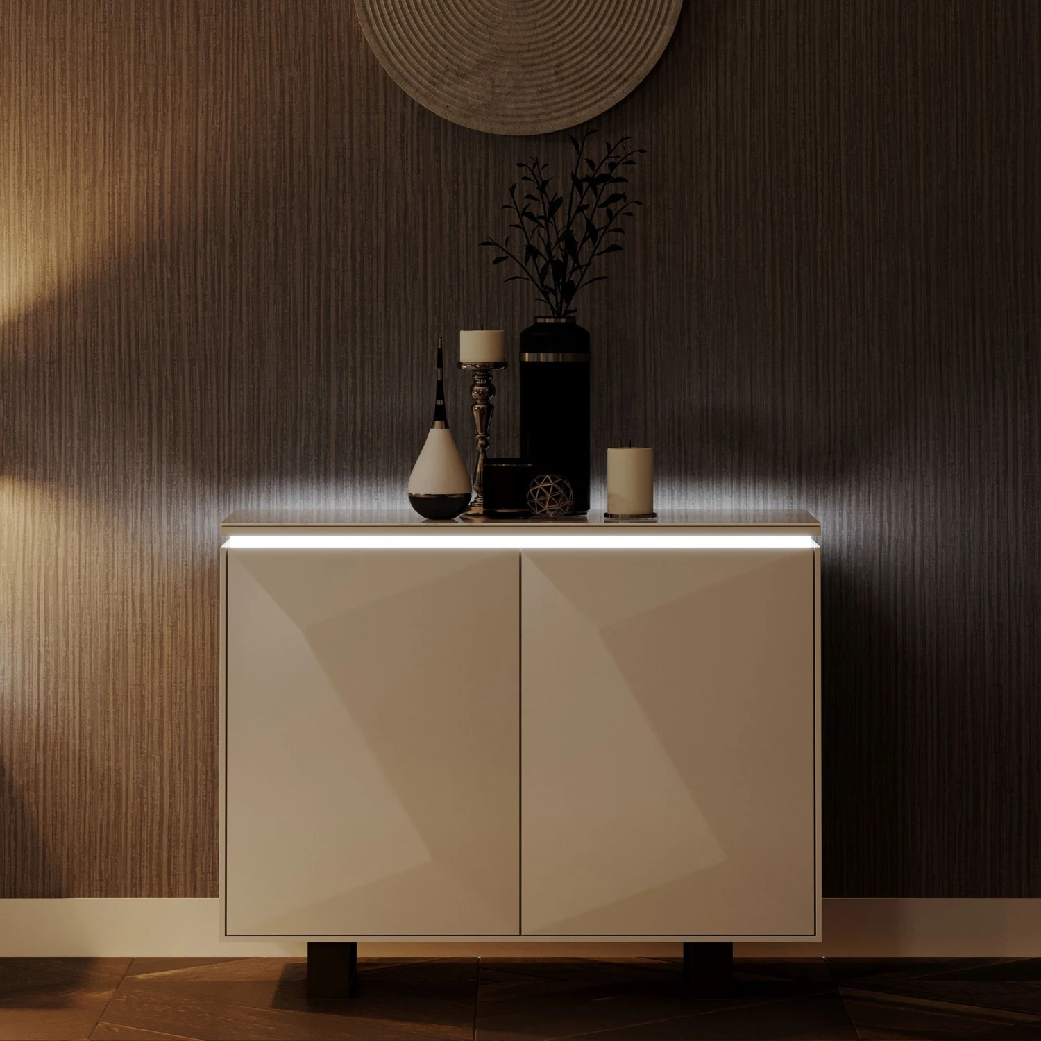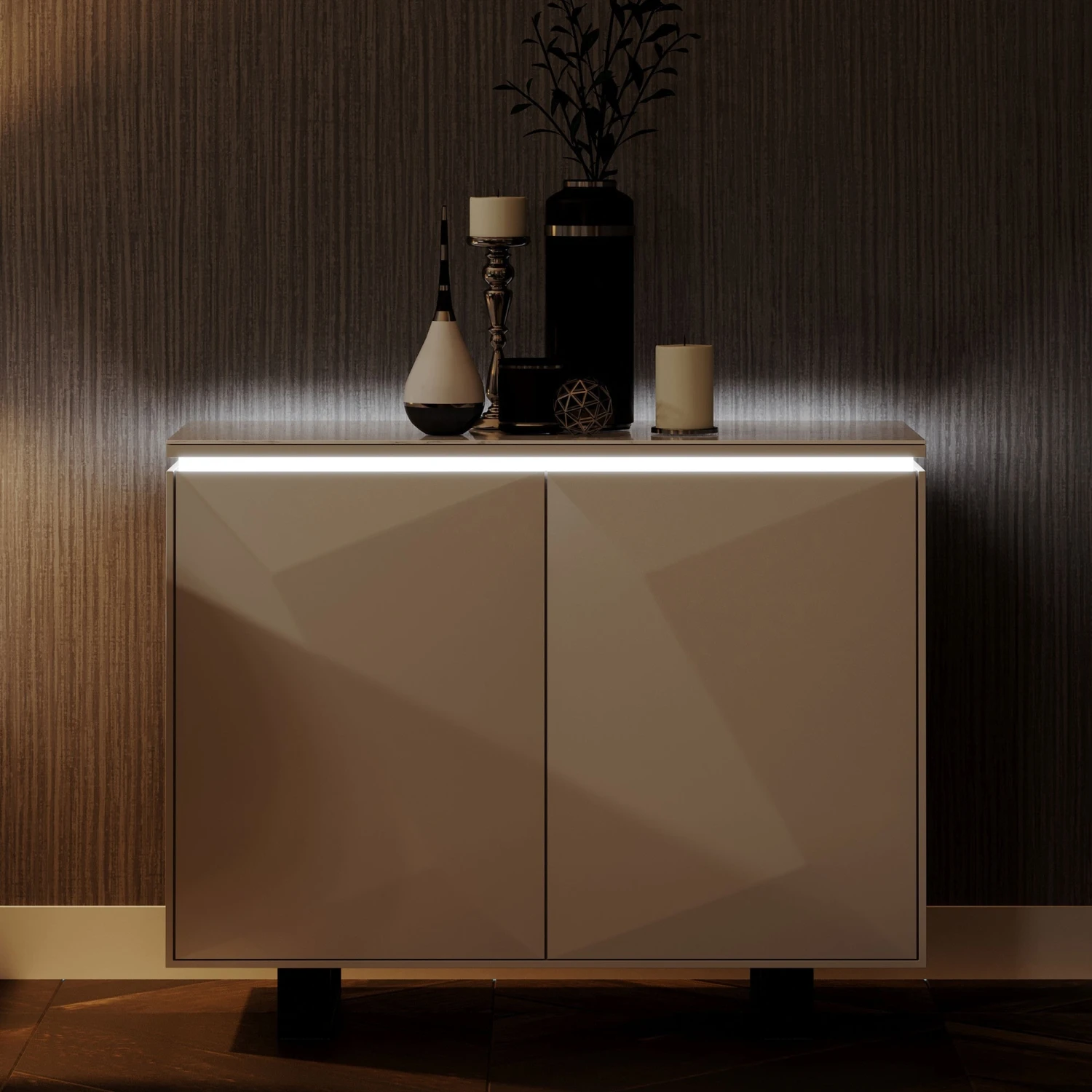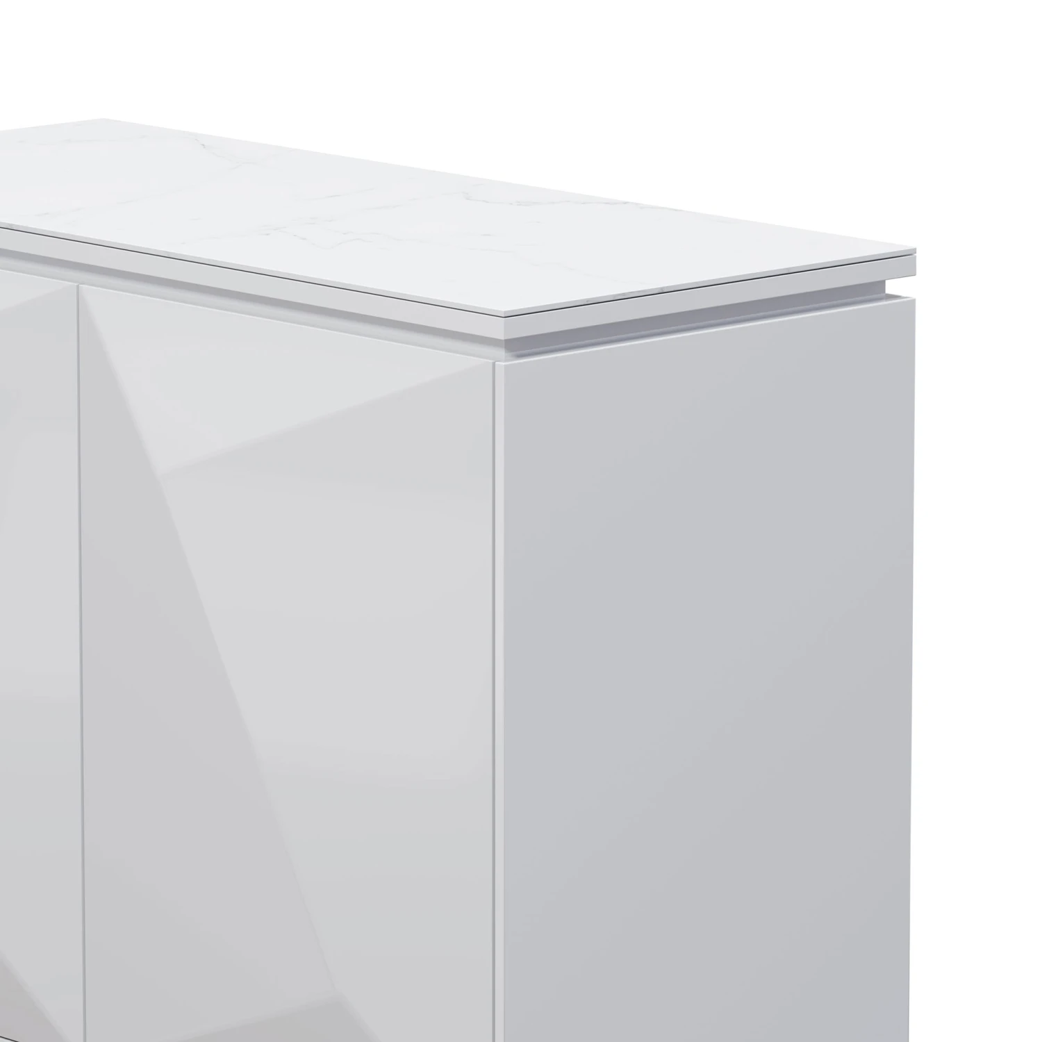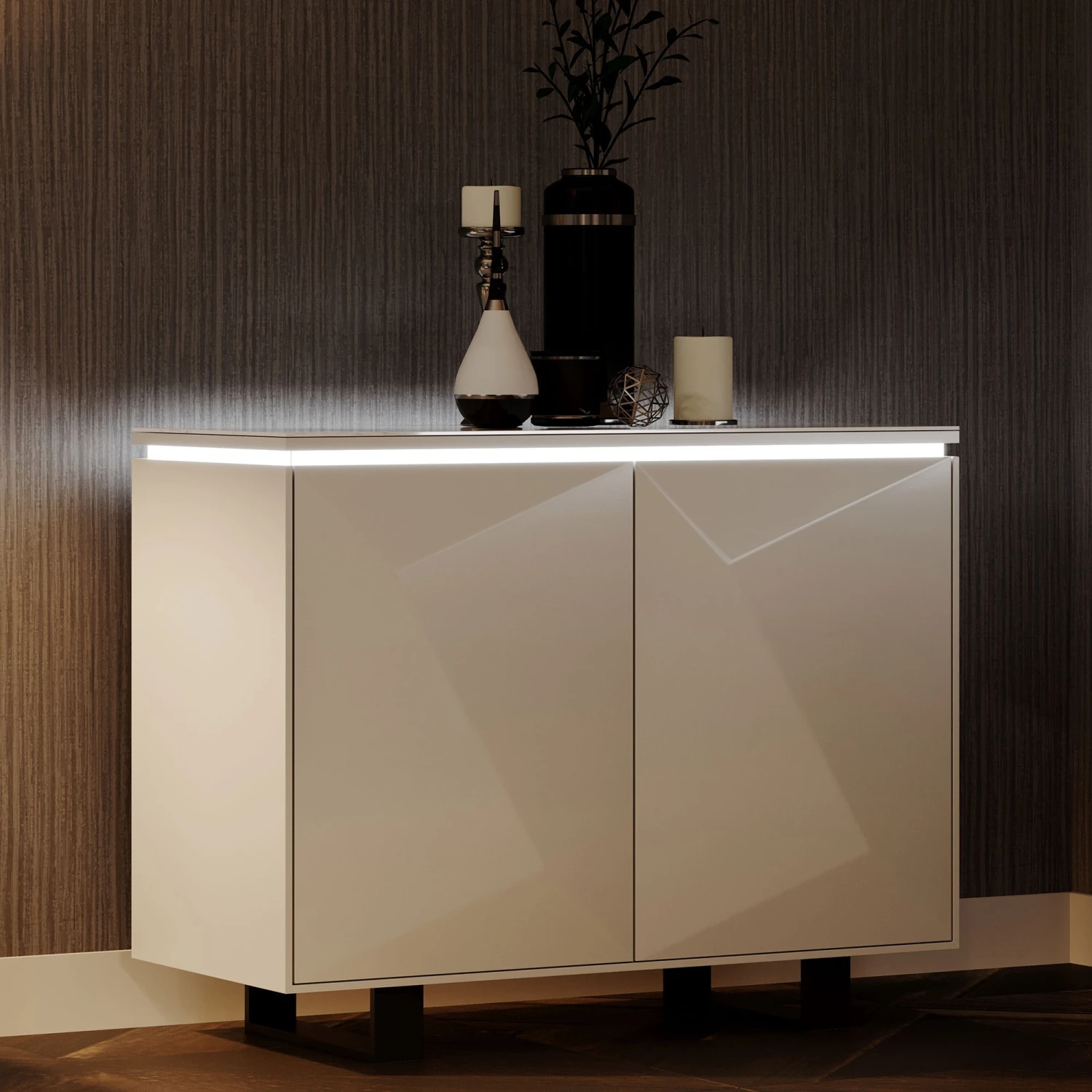 Add this luxury and modern design to your home with the Belarmino Gloss Grey Standard Sideboard. The sideboard comes in a sleek grey gloss finish with a bevelled design and is topped with a faux marble top in white and grey. Offering plenty of storage the sideboard features 2 doors with internal shelving. By night the sideboard features a white LED light around the top of the cabinet, creating a cosy atmosphere in your home. To finish the sideboard is mounted on contrasting black U shaped legs.