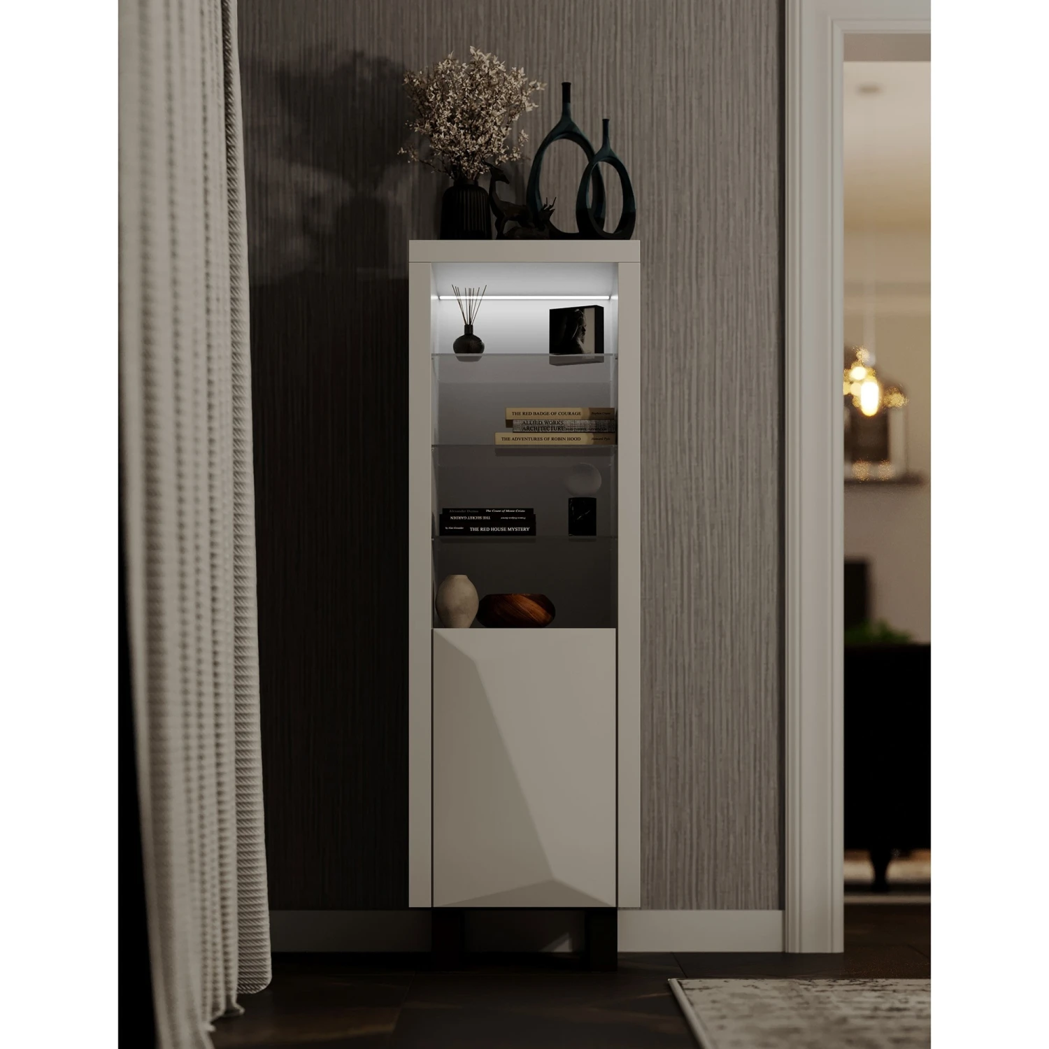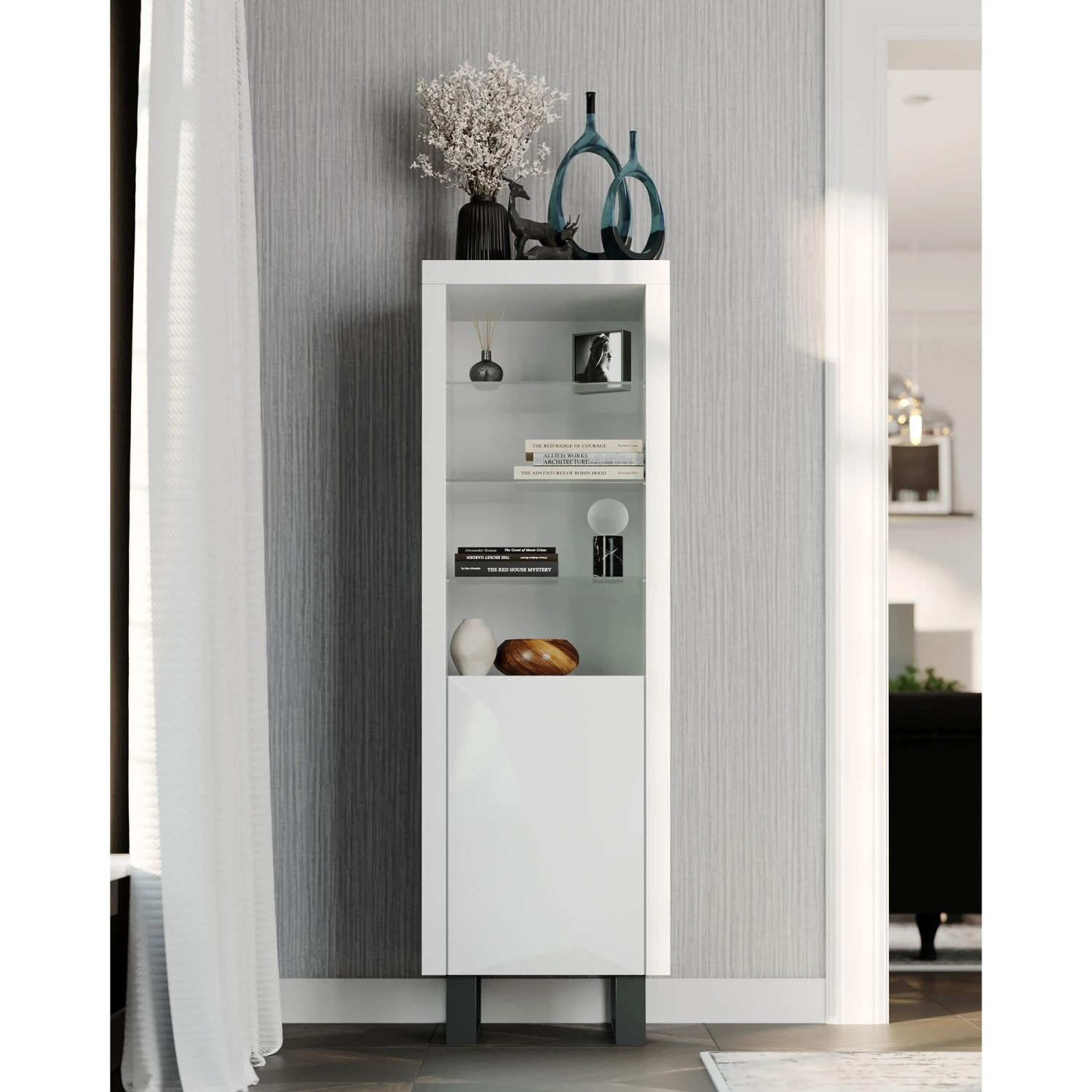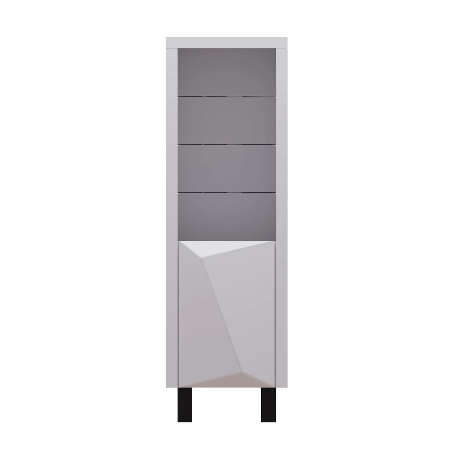 Adding a luxury and modern design to your home with this Belarmino Gloss Grey Tall Narrow Bookcase. The bookcase comes in a sleek grey gloss finish with a bevelled design and is mounted on contrasting black U shaped legs. Offering plenty of storage the bookcase features 3 glass shelves and a door to the bottom featuring a bevelled design, adding interest to the bookcase. By night the bookcase features a white LED light around the top of the cabinet, creating a cosy atmosphere in your home. Display this bookcase with other matching items from the Belarmino Dining Grey Collection.