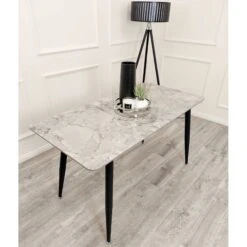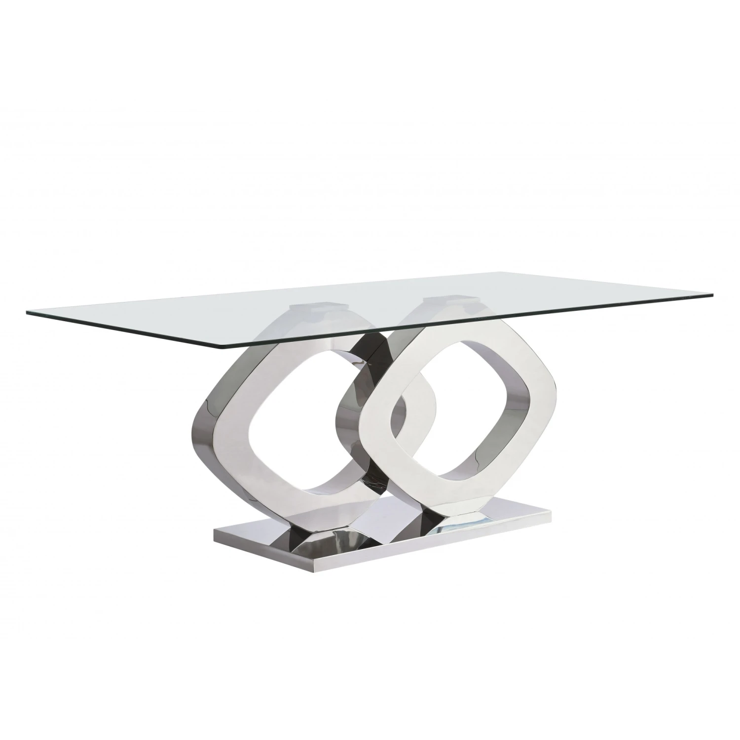 Adding a unique style to your dining room this Donique 2.0m Diamond Shaped Chrome Base Table features a statement base. The table is topped with clear glass and stunning chrome base made up of 2 diamond shapes to create the base. Pair this table with your own choice of dining chair to match your interiors.