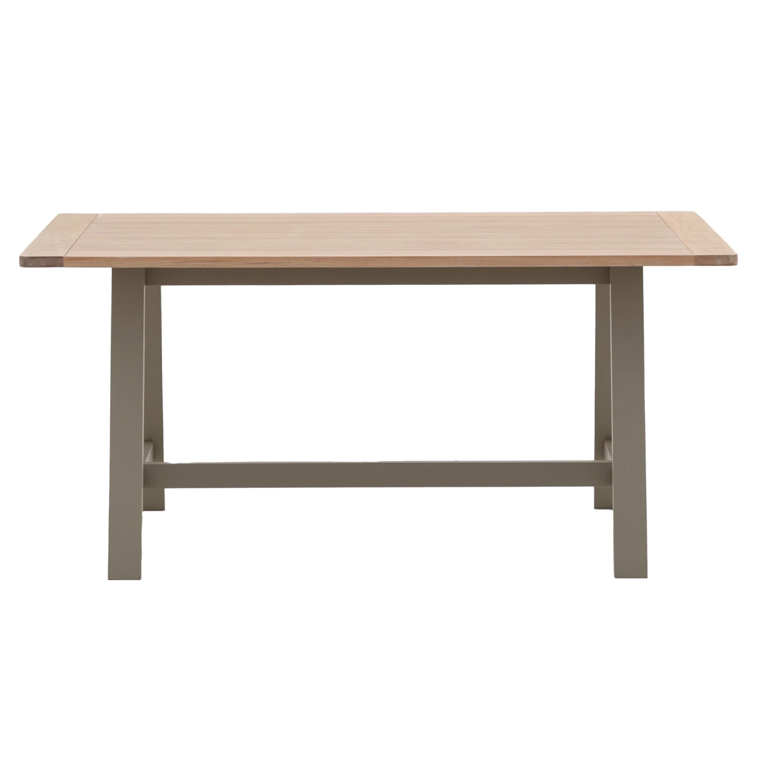 Adding a country style charm to your dining room or kitchen area with this stunning designed Eton Prairie Trestle Table 160 x 80 x 75 cm. The dining table is crafted with angular hand painted solid timber legs in a prairie sage green tone and a grooved & planked oak top. The table will look stunning paired with matching dining chairs or bench or your could style with your out choice of chair to suit your interiors.