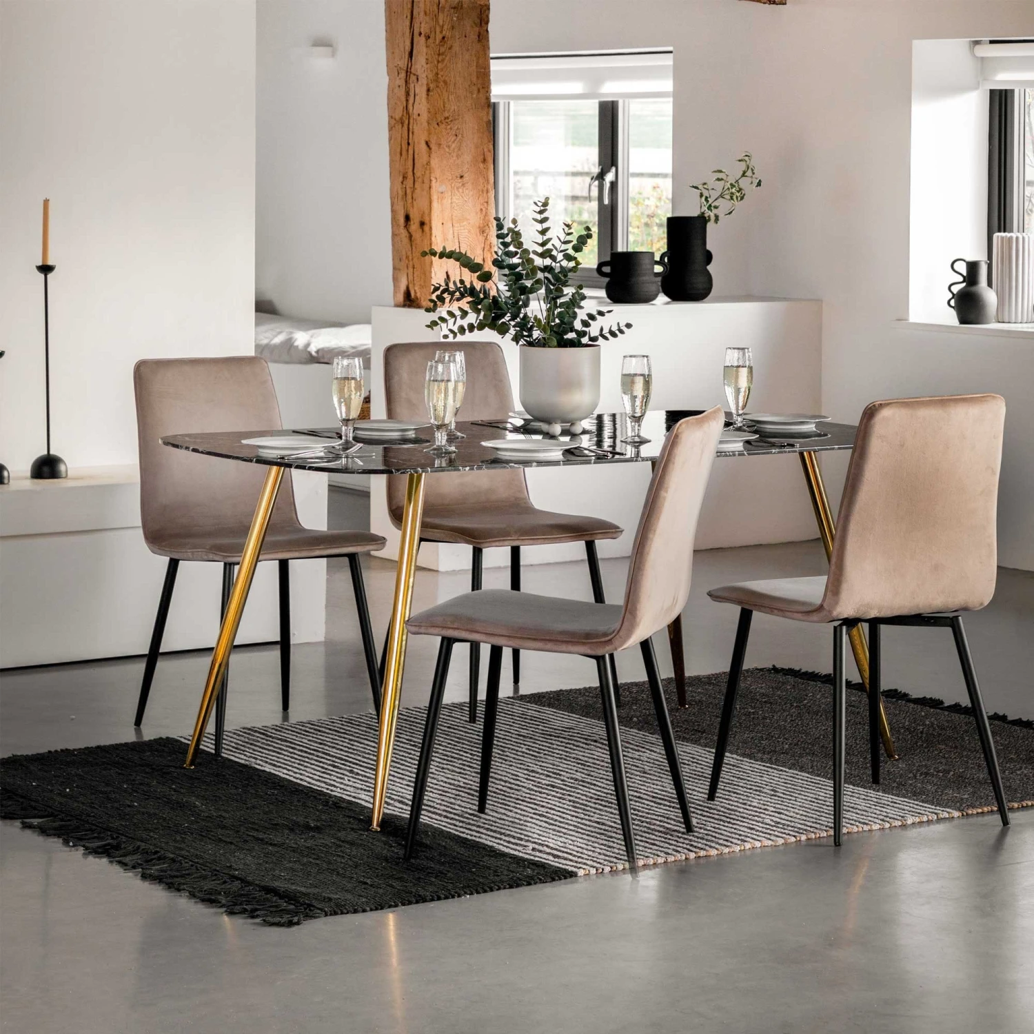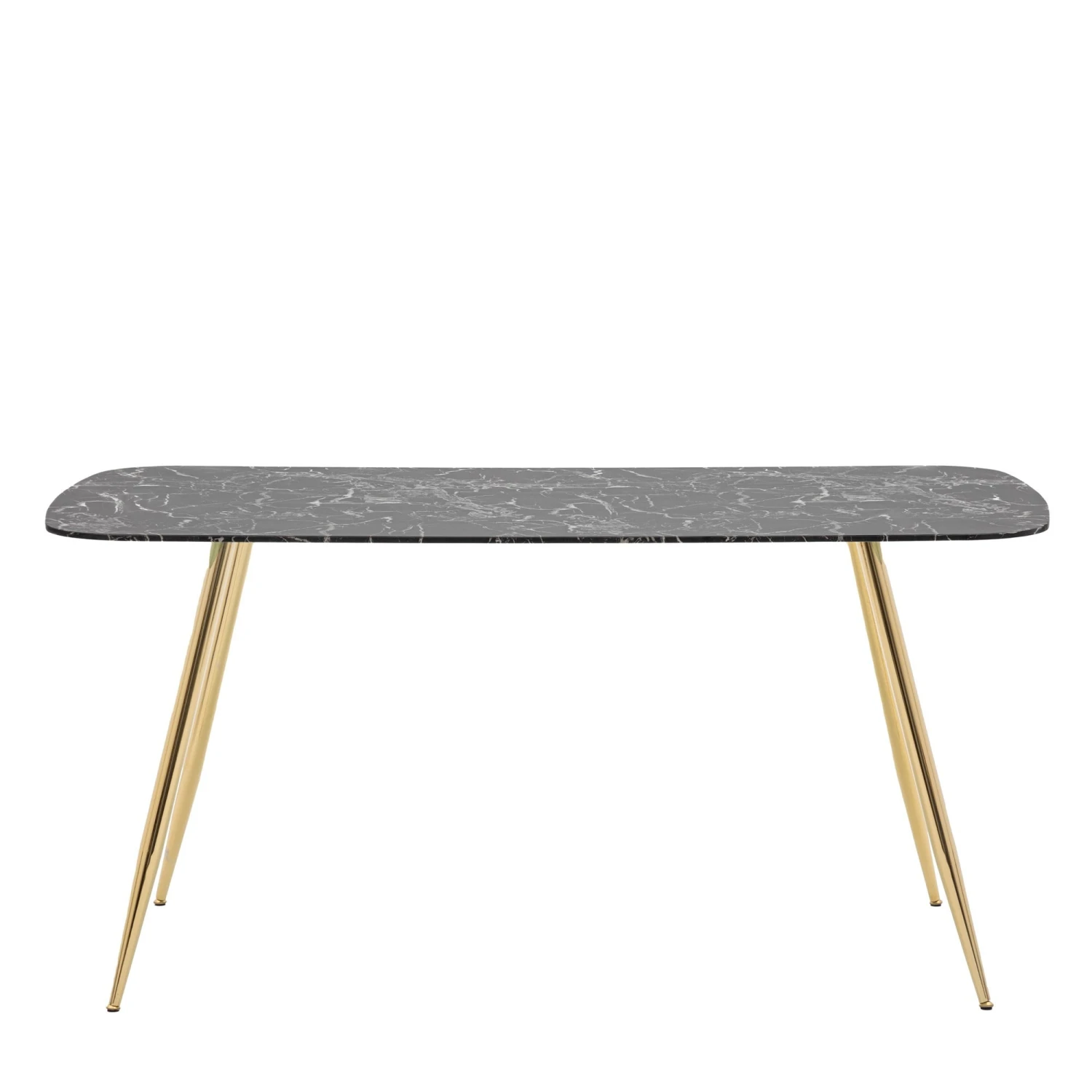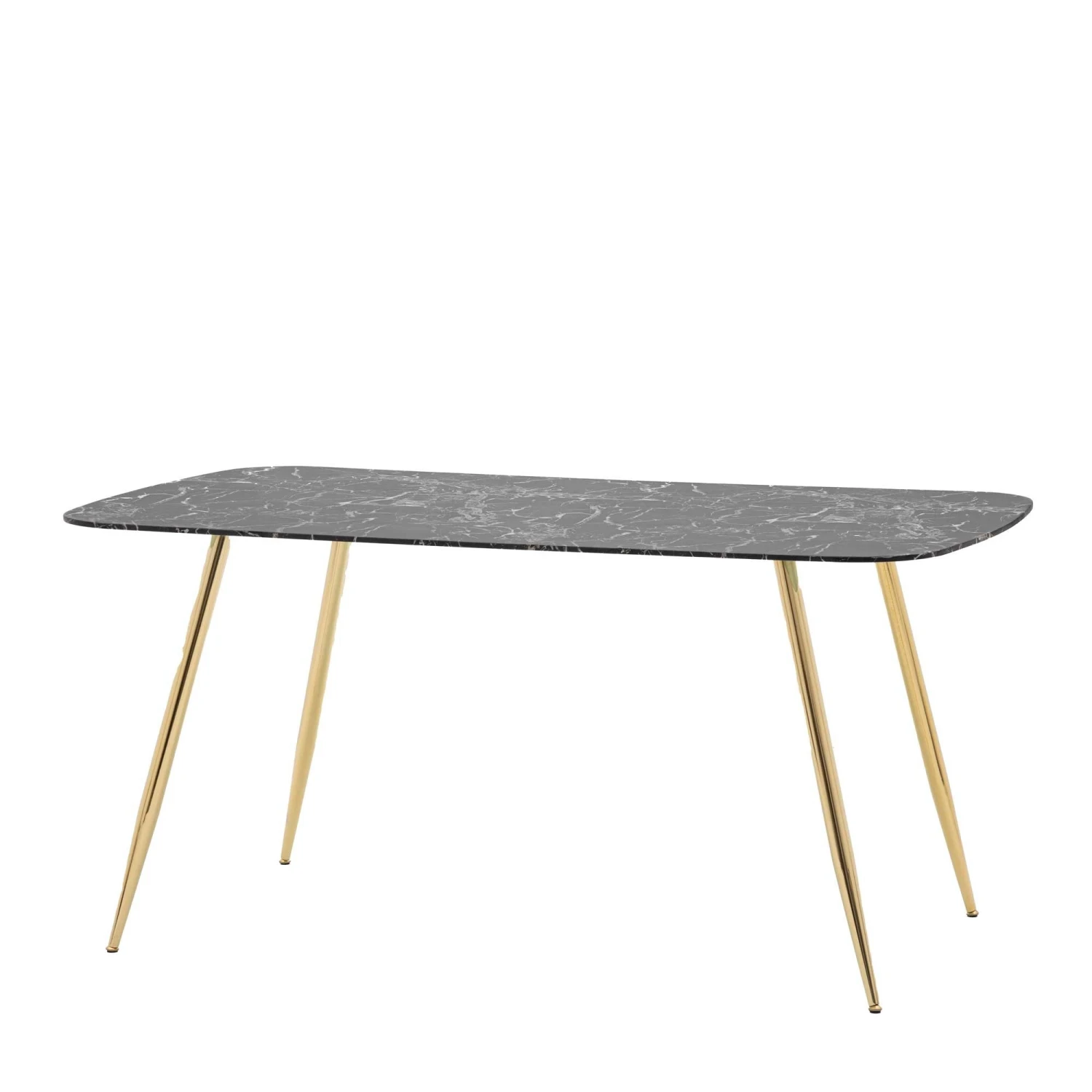 With a faux marble black tabletop, this Evans Black & Gold Dining Table brings a level of sophistication to your dining area with its contemporary finish. Crafted with a glass rectangular tabletop, it stands upon solid gold metal legs, offering contrast between colours to make a statement feature that seats up to 6 people whilst dining.Â