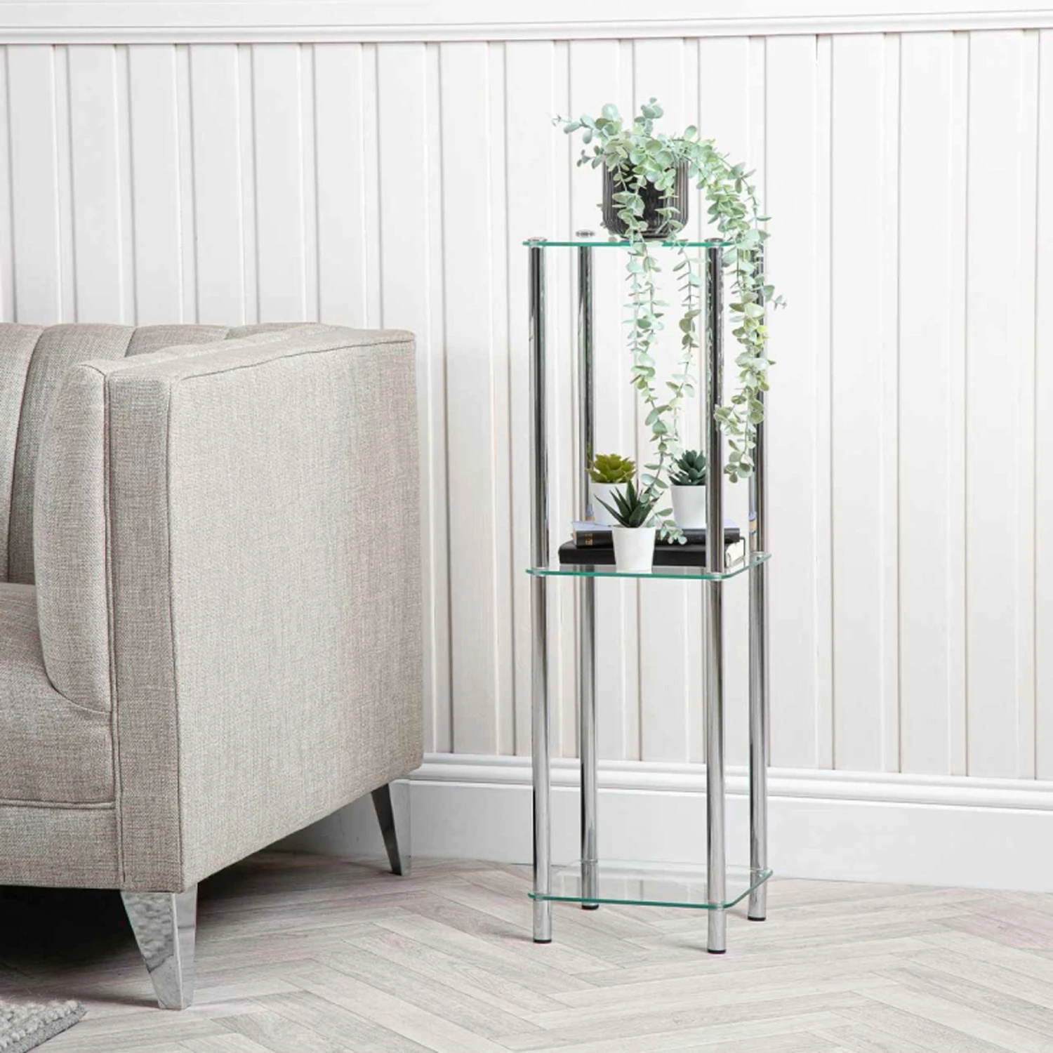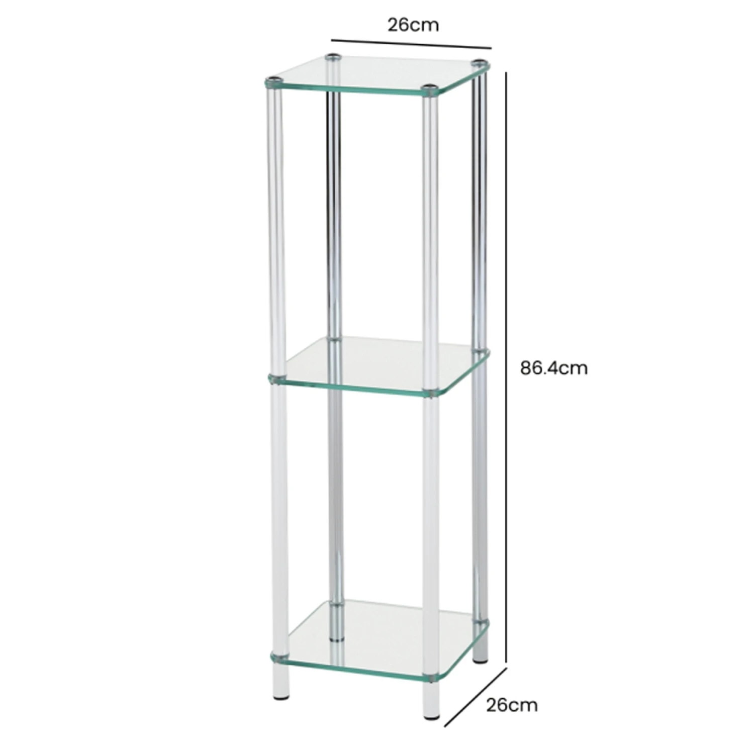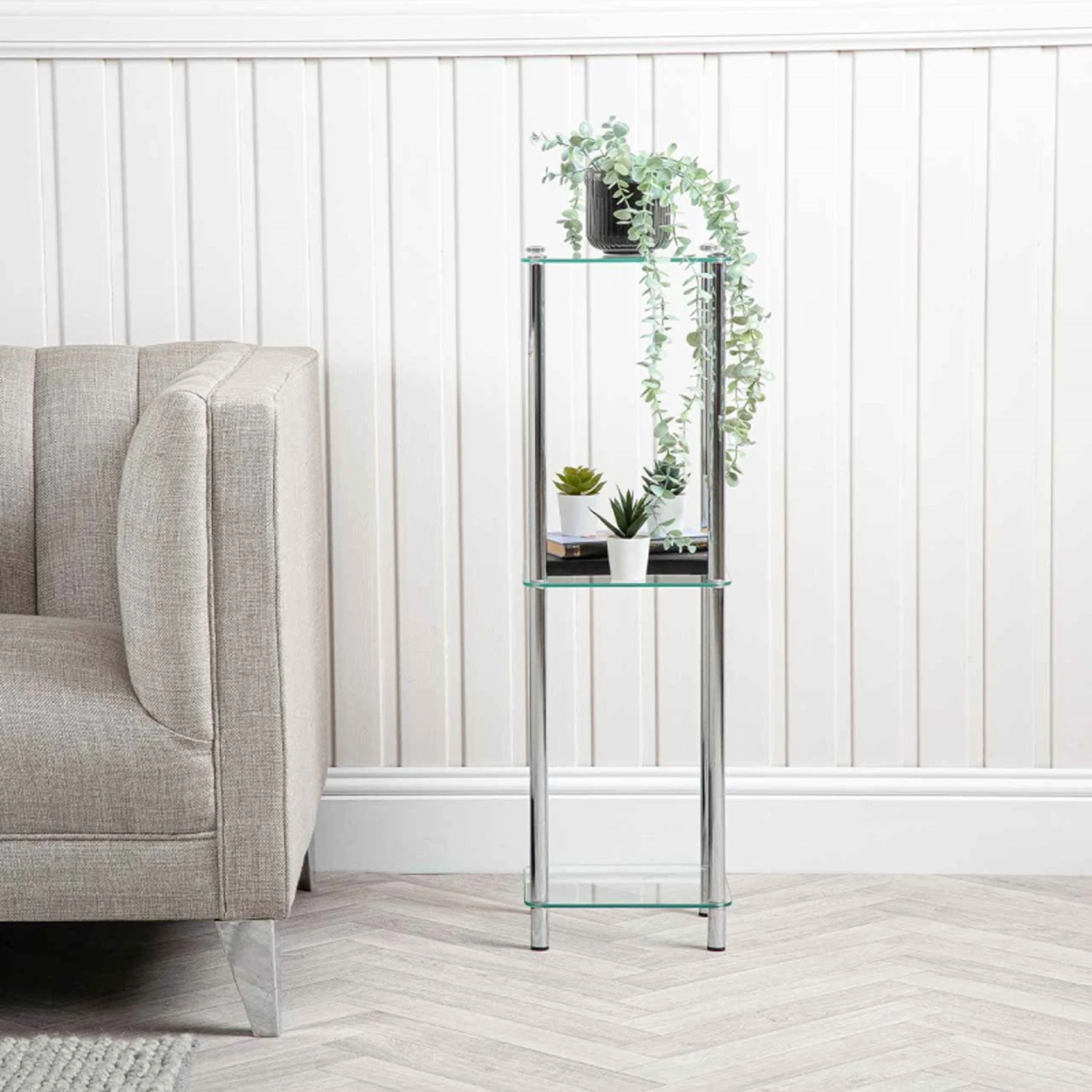 The Harry 86cm Chrome and Glass 3 Tier Display Unit would be an amazing addition to the home. Includes 3 glass shelves supported by high quality steel in a beautiful and stylish chrome finish. Could be used in the hallway to display artwork or the dining room to store plates and bowls.