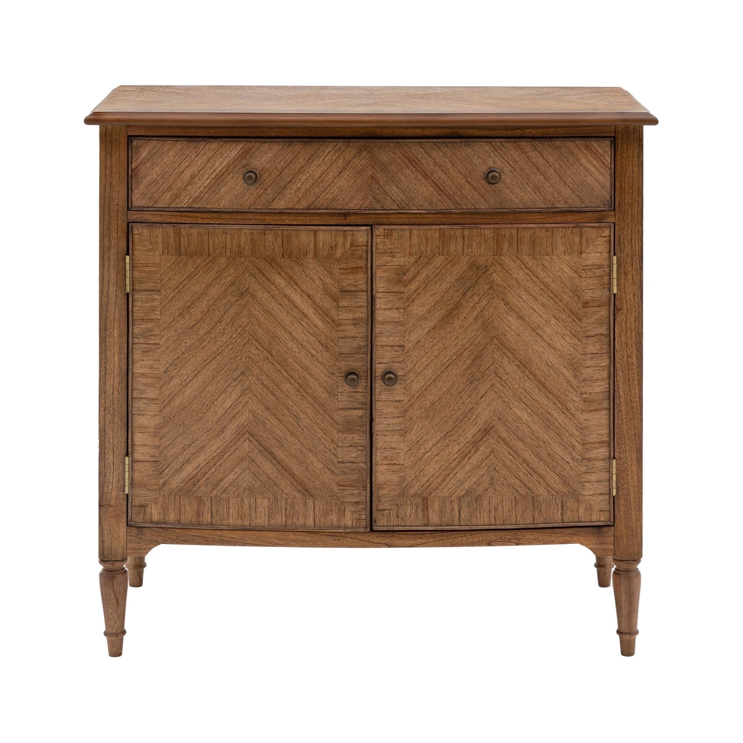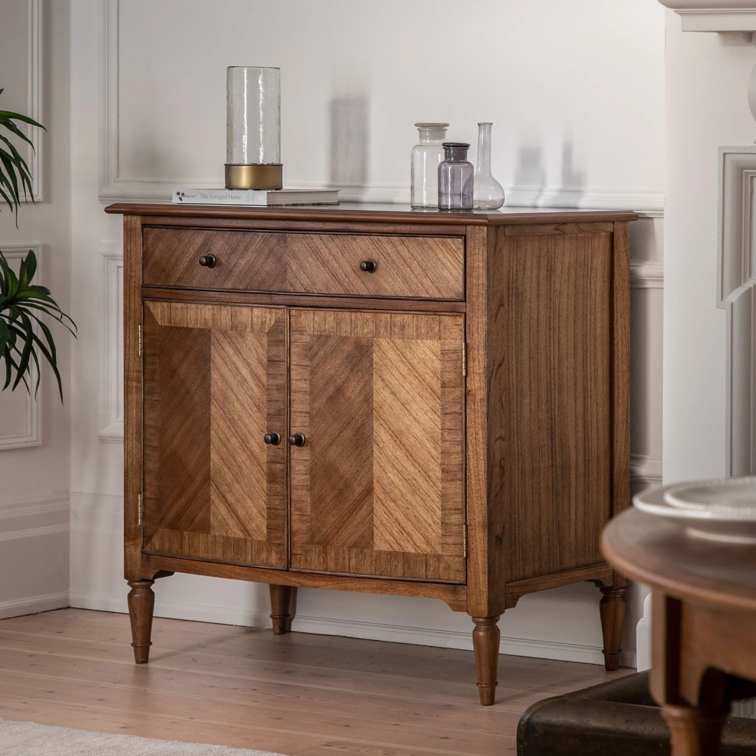 Add a retro charm to your living or dining room with this Highgrove Peroba 2 Door/1 Drawer Sideboard 100 x 95 x 45 cm. The sideboard is crafted with solid Mindy wood in a rich mid brown tone. The sideboard offers plenty of storage space with 2 doors and a spacious drawer. The sideboard features wood veneer marquetry and is complete with bronze beehive pull handles to compliment the design.