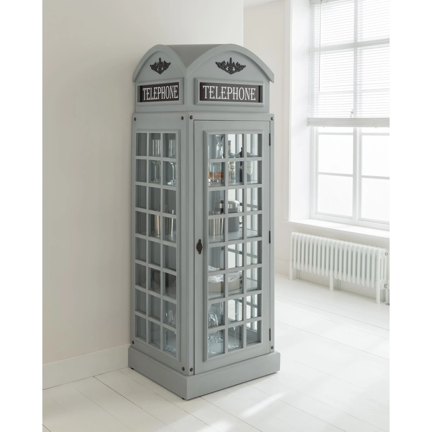 We are proud to introduce this stunning grey drinks cabinet to our display cabinet range. Add character and charm instantly to any room with this grey display cabinet, you are sure to impress. With the ample storage space in this unique display cabinet you will be able to safely store and protect all the ornaments that you wish.Â