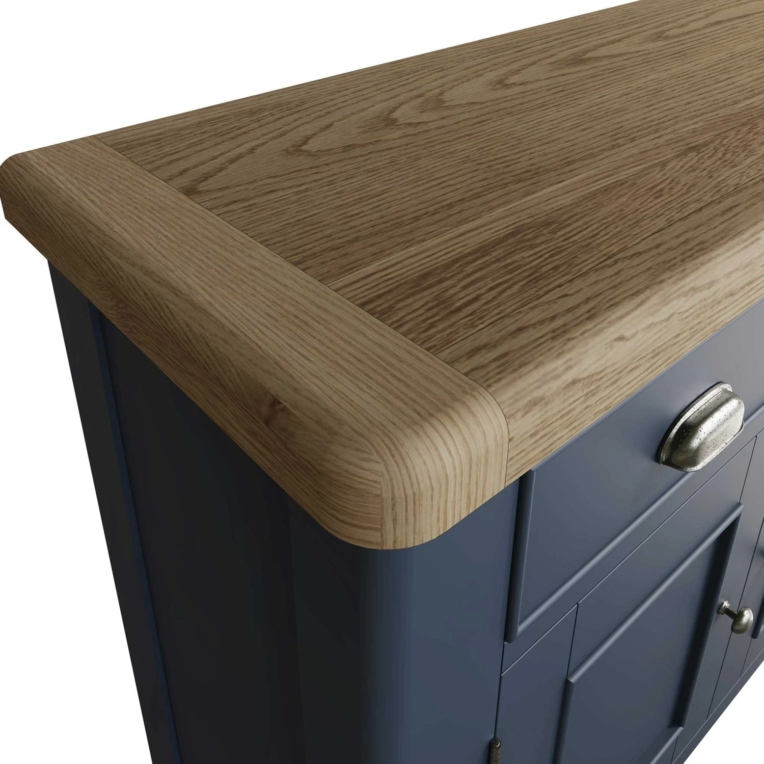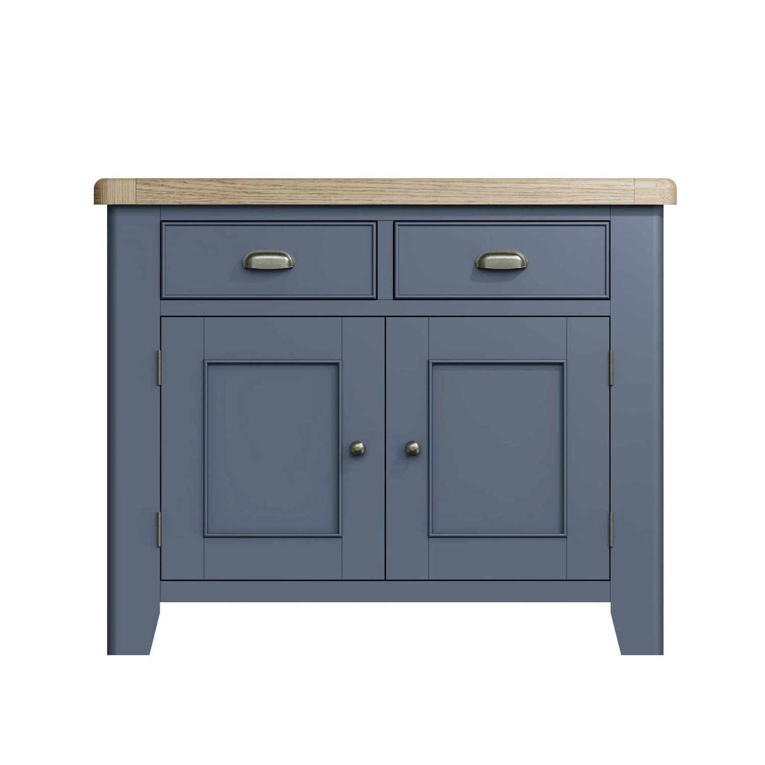 Add this Hopton Blue 2 Door Sideboard to the kitchen or dining room and store all of your kitchenware! The modern 2 door sideboard offers lots of storage space and features 2 drawers for extra storage. This sideboard is finished in a modern rich blue with a thick oak top and rounded corners for a stunning contemporary look. Matching items available.Â