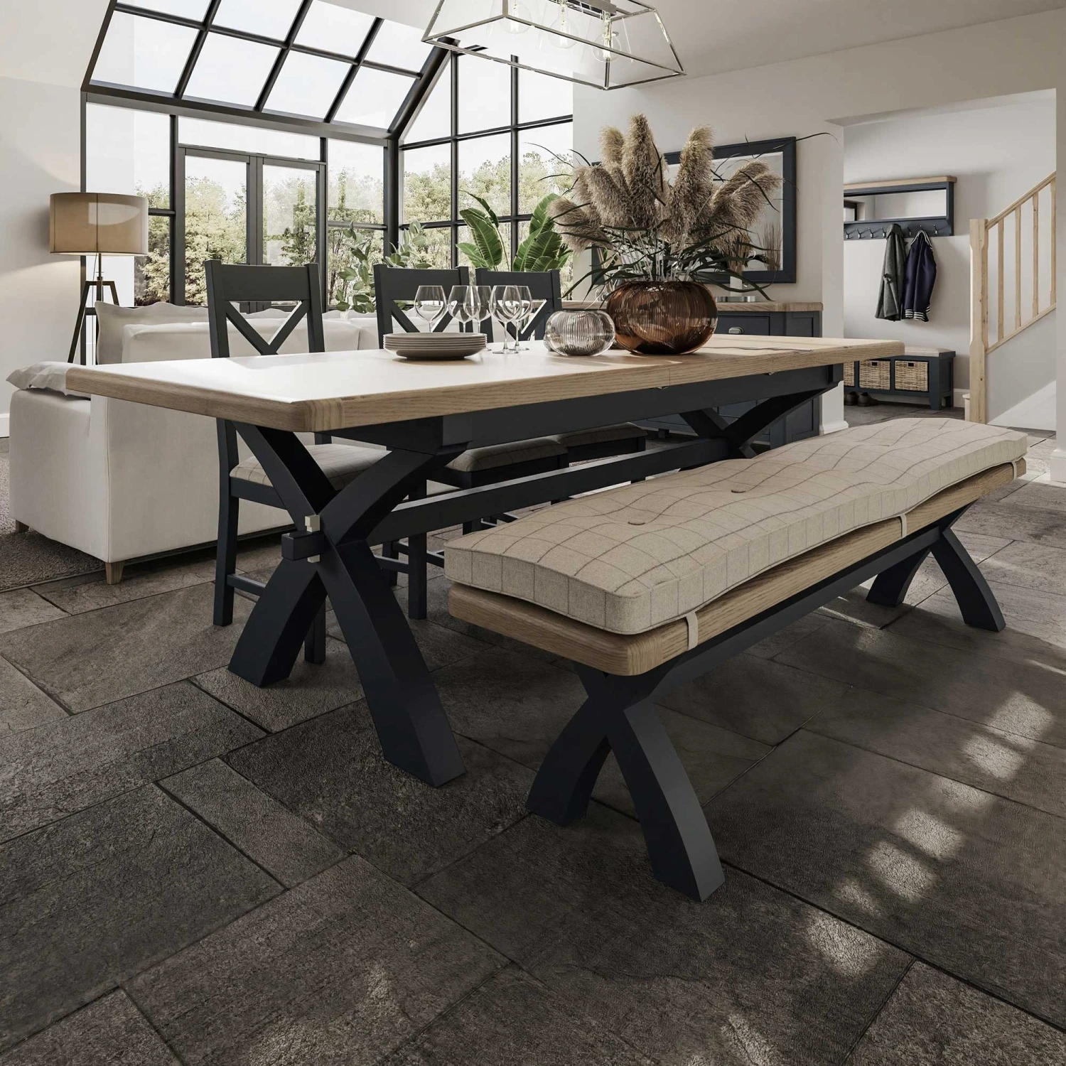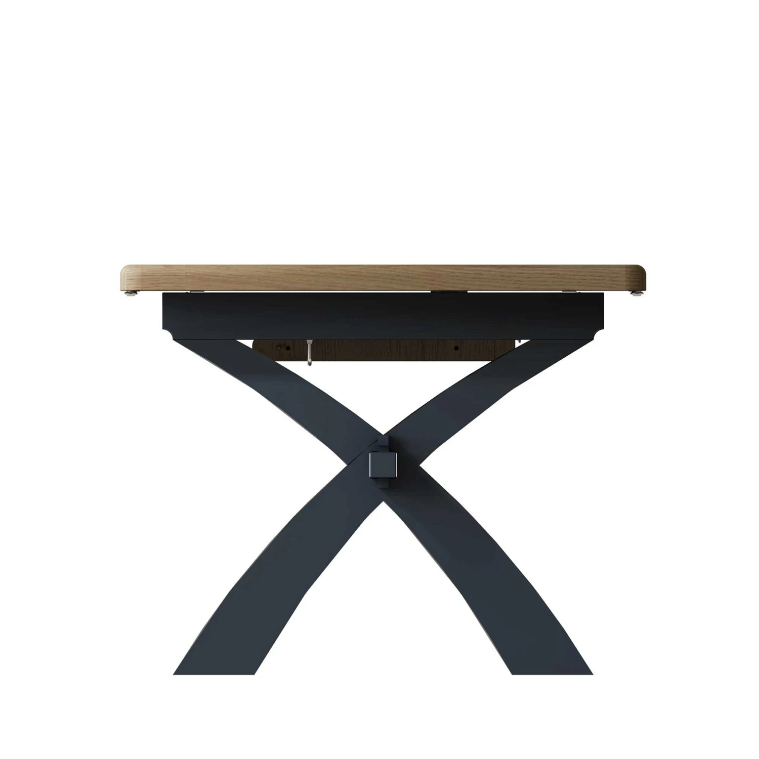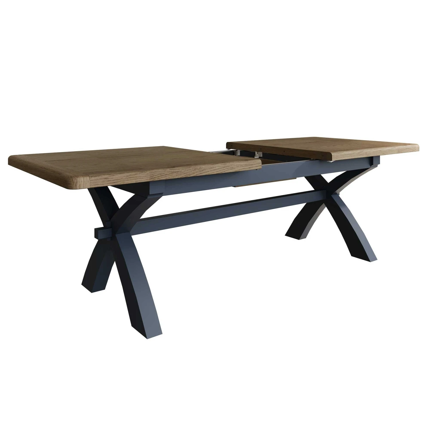 This Hopton Blue 2m Cross Leg Dining Table is ideal for large families or homes that host a lot of parties! Seating up to 8 people, this dining table features a stunning cross leg design and is finished in modern blue for a rich and classical look. The rectangle dining table is topped with a high quality thick oak top that is easy to clean. Matching items available.Â
