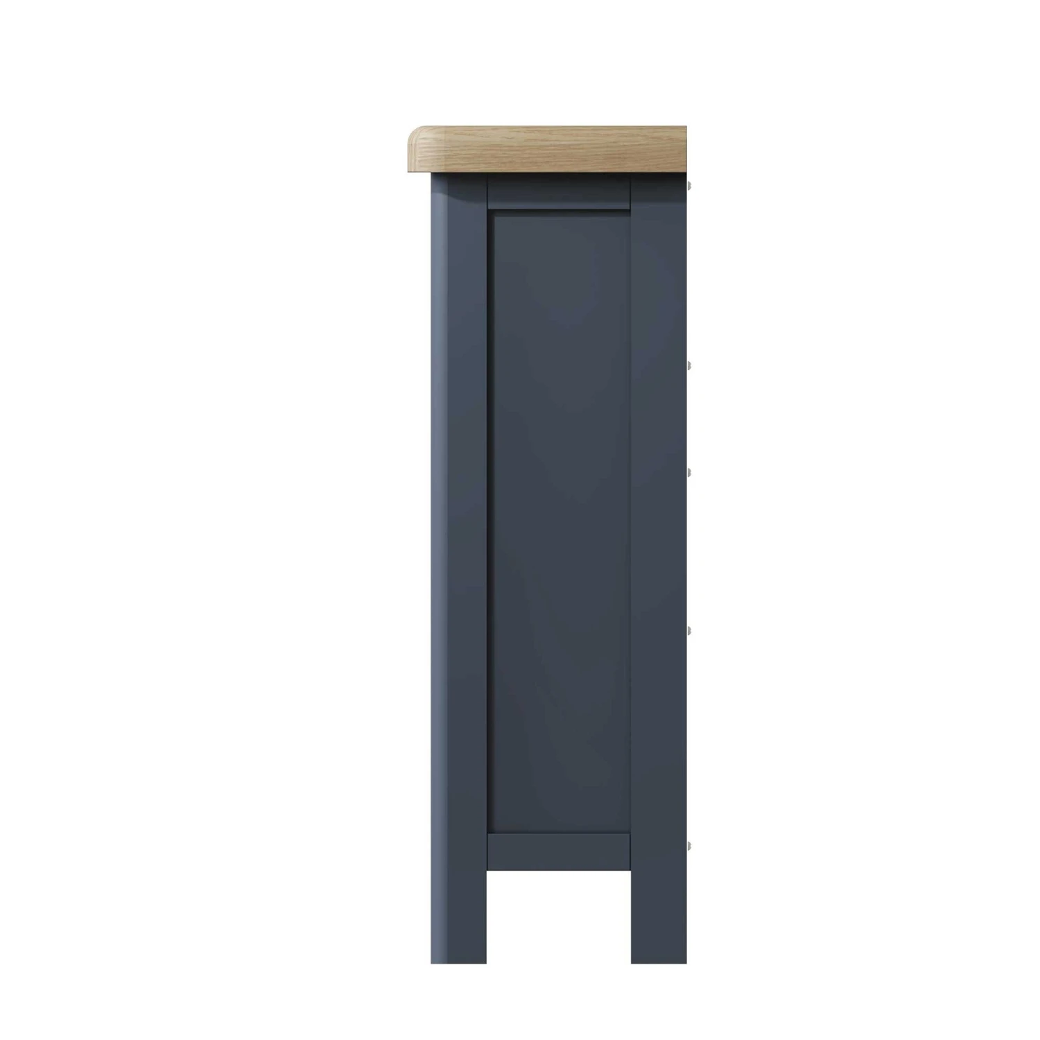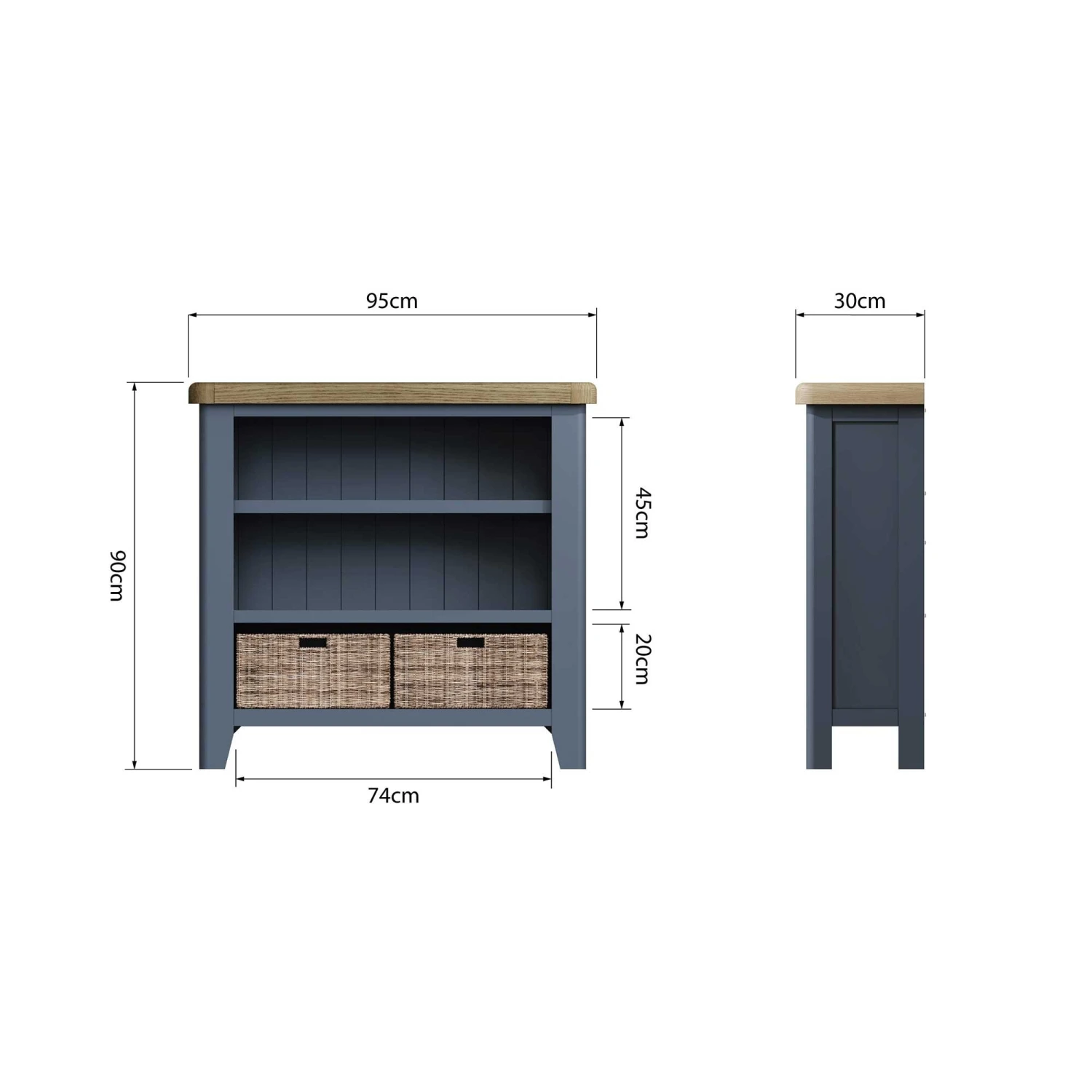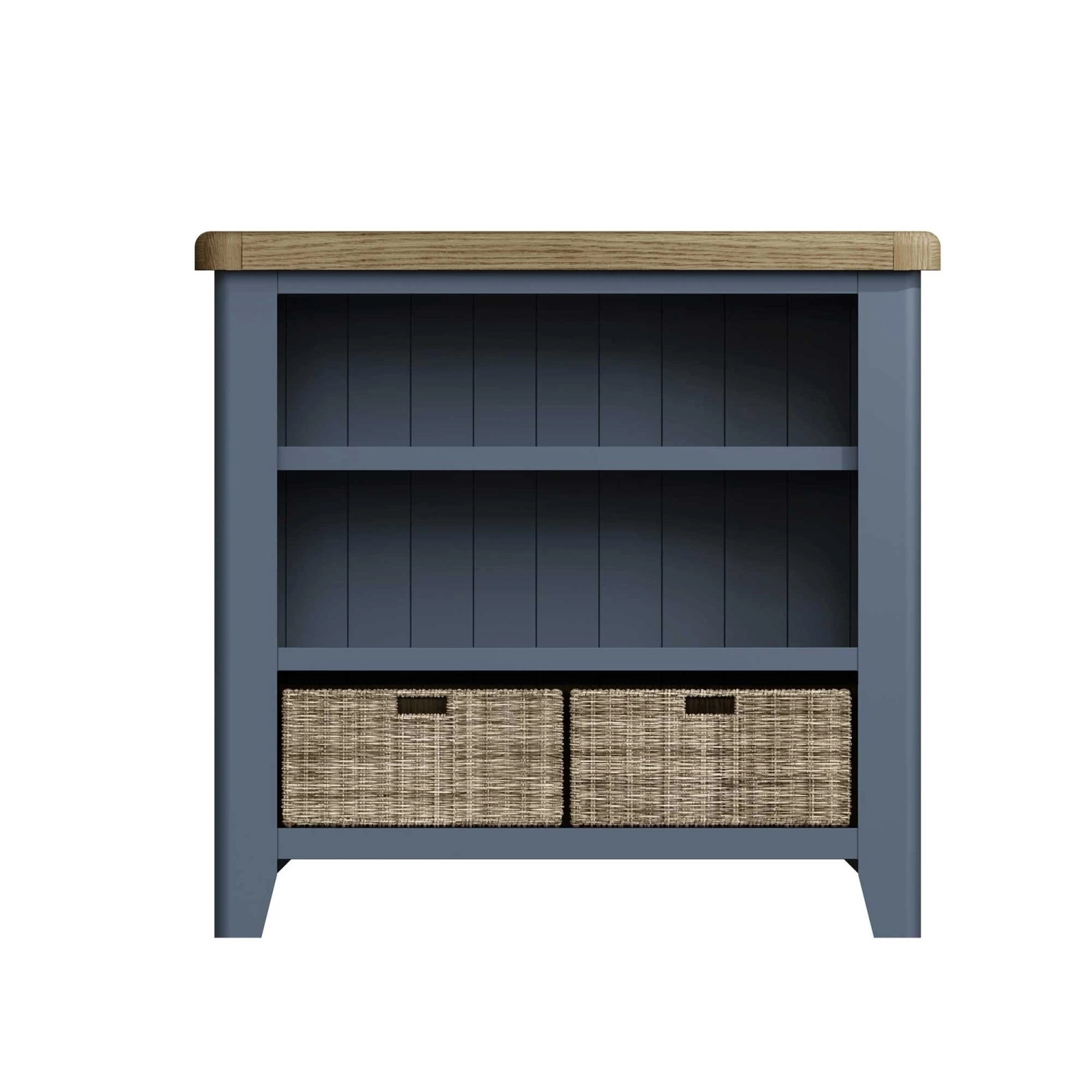 Display your favourite cookbooks on this Hopton Blue Small Bookcase in the kitchen or dining room! This small bookcase features 2 shelves and 2 baskets to help keep your room in order! The bookcase has a modern painted blue finish and is complete with a thick oak top for a contemporary look. Matching items available.Â
