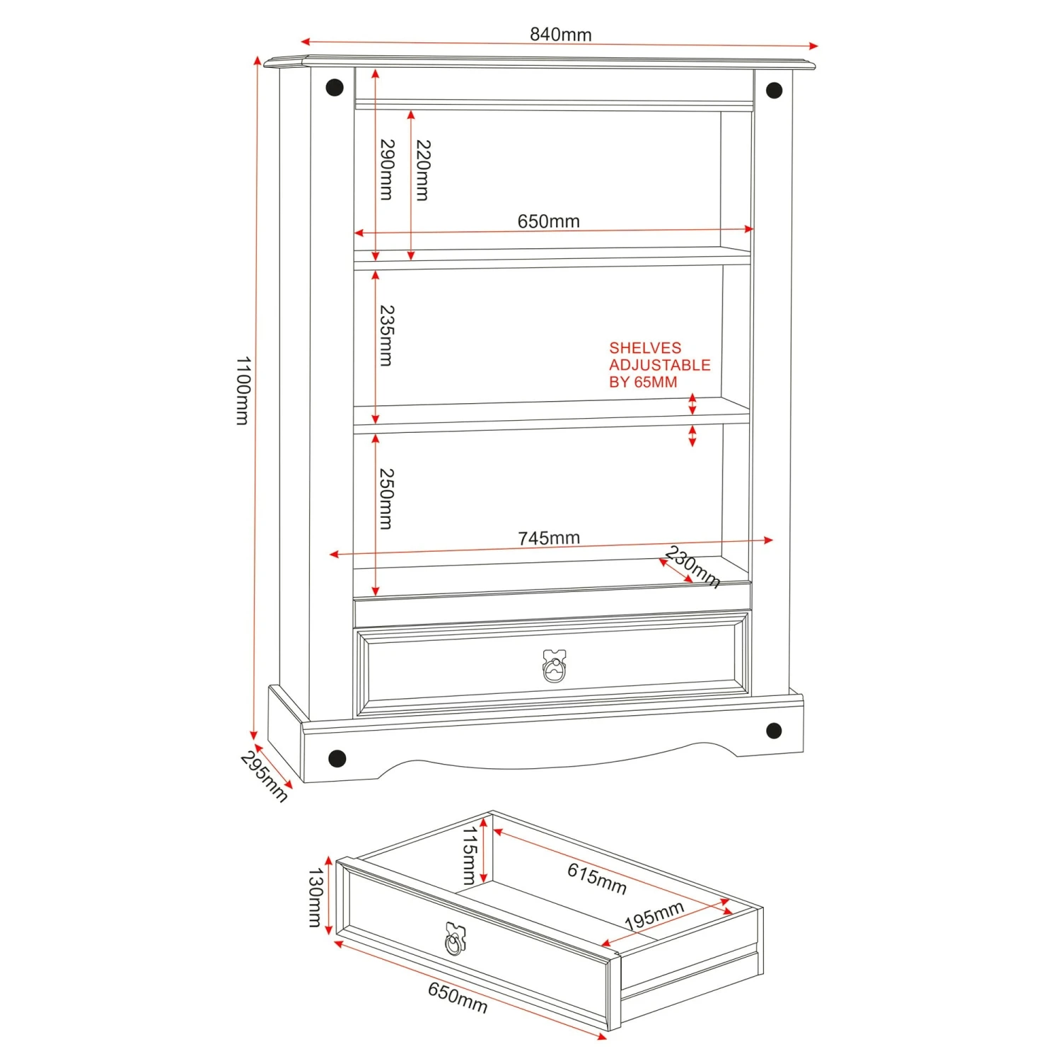 This Huxley Pine 1 Drawer Bookcase is made with distressed waxed pine and has metal studded detail in the corners. It has 3 shelves, allowing you to showcase your collection of books or novels, and can also be used as a surface to display photo frames or ornaments. These can be adjusted by 65mm. The bookcase has 1 drawer at the bottom of the unit, perfect for storing items. Anti-tip strap included.