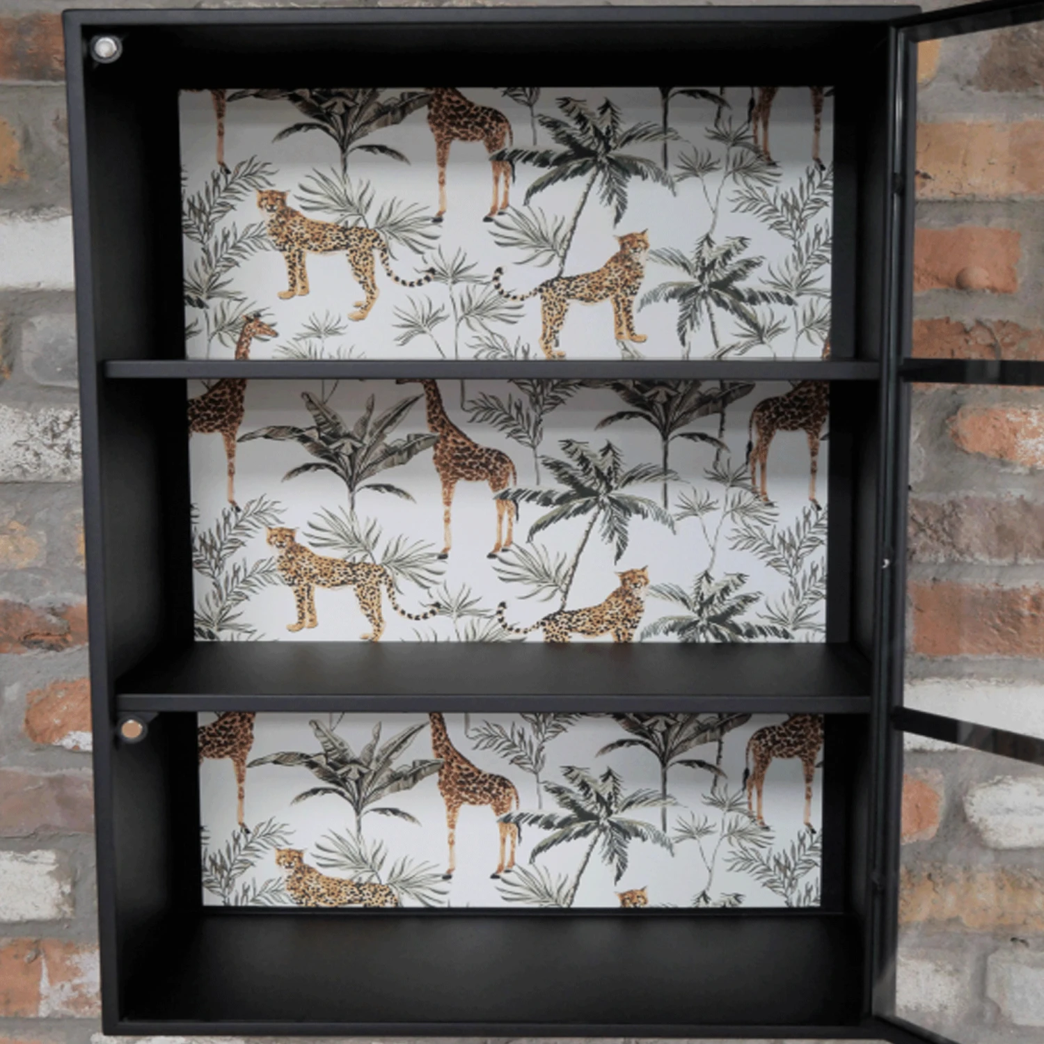 This simple, modern designed industrial display wall cabinet is the perfect place to store your most prized possessions. Made from metal with a tempered glass front door, it comes in solid black to fit into any interior. In its interior, houses 2 shelves to split the industrial display wall cabinet into sections for extra storage space. Behind those shelves, has an animal print background to add detail and make it stand out. This industrial display wall cabinet would be ideal for your lounge or dining area for those ornamental pieces.