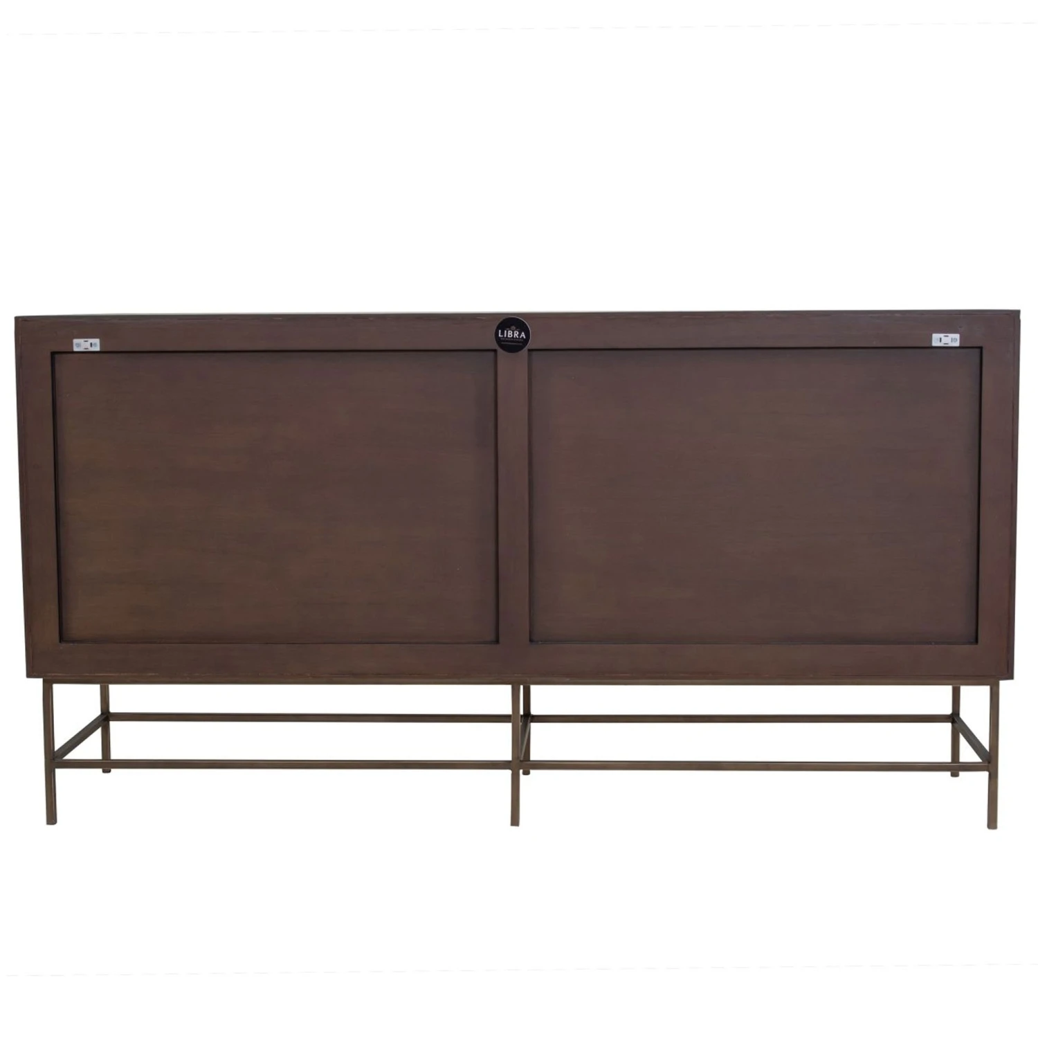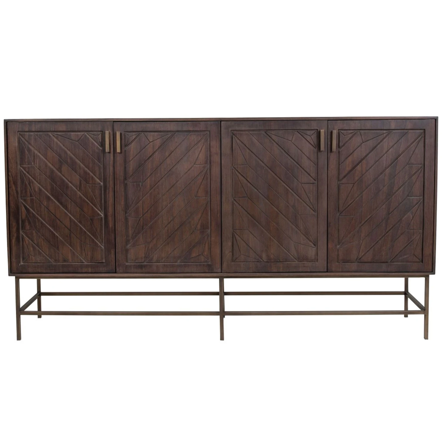 Crafted with mindy wood this sturdy Japandi Four Door Wooden Cabinet would make a generous drinks cabinet, sideboard for your living or dining room or your could even use as storage in your bedroom. The cabinet features a decorative carved geometric pattern to the 4 doors, each with secure magnetic catches and internal shelving inside. The cabinet sits on solid iron legs in a tonal colour to blend effortlessly.