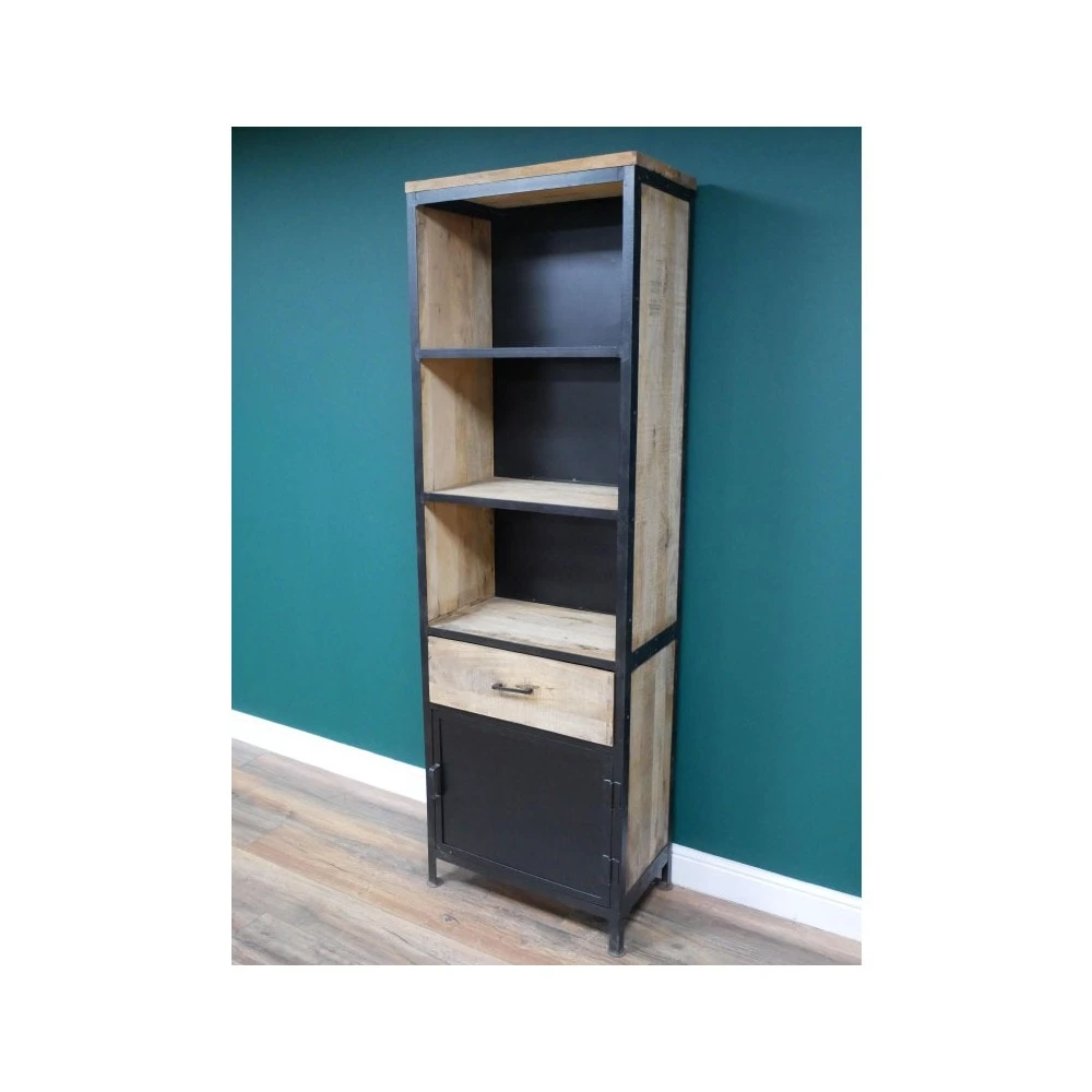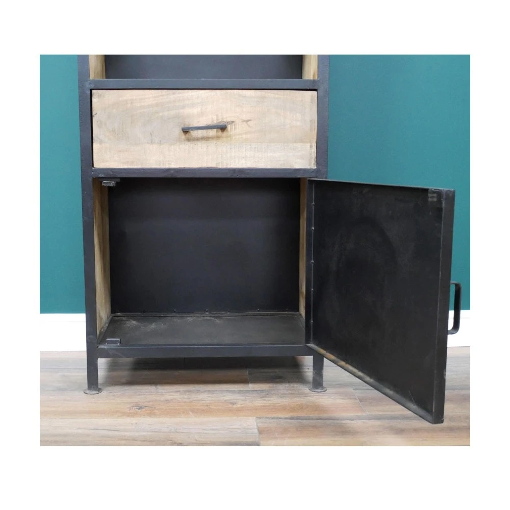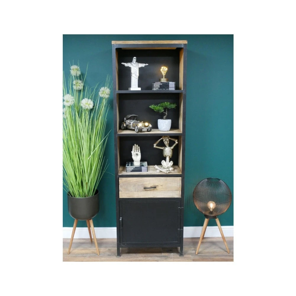 Adding an industrial feel to your home the Large Industrial Iron Bookcase / Shelves can be used to display your ornaments, plant and lamps or as a bookcase with the 3 large shelves. The bookcase also comes with a wooden drawer and cupboard for extra storage and is crafted with black iron and features wooden trimmings to add interest.
