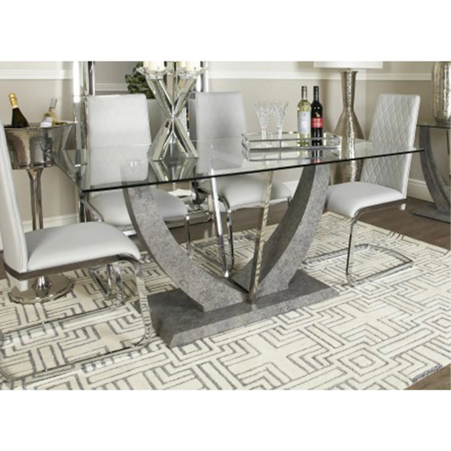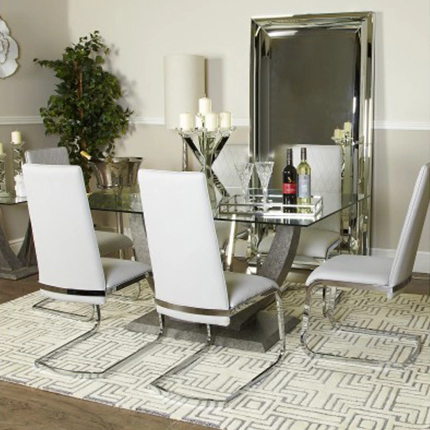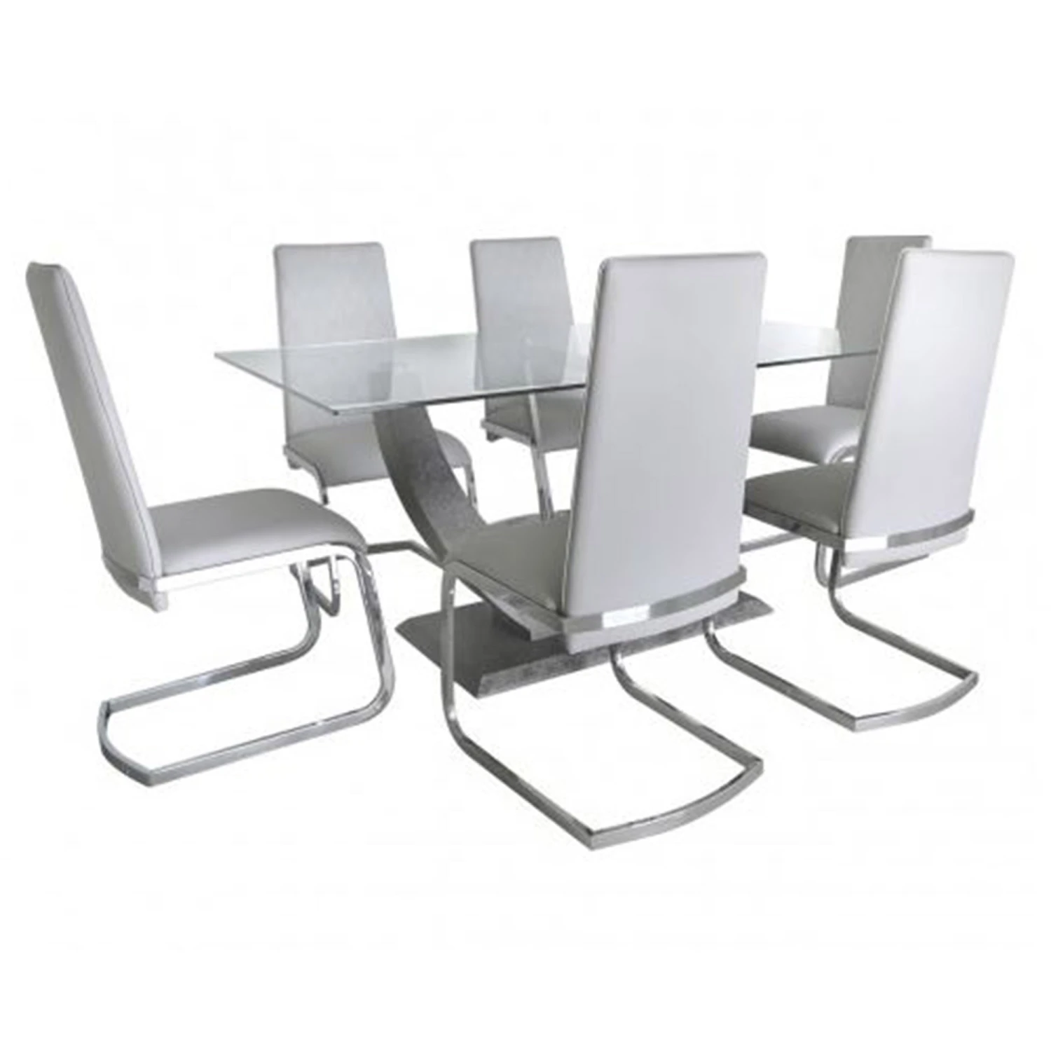 Give your home more of a elegant and sophisticated look with this stunning dining set. Coming with a V shaped metallic base and toughened glass table top to withstand heavy usage, this piece also features light grey faux leather chairs and definitely wont disappoint.