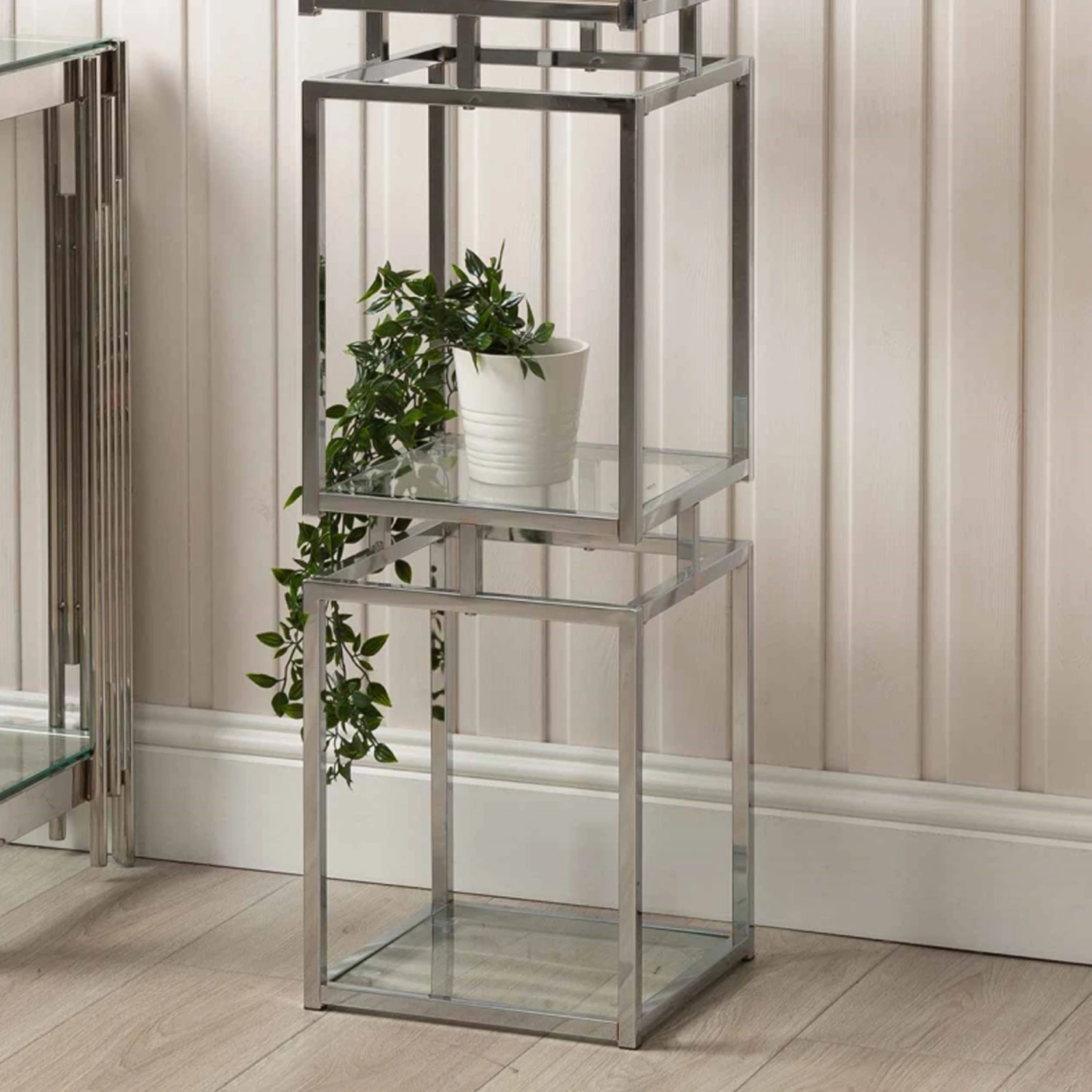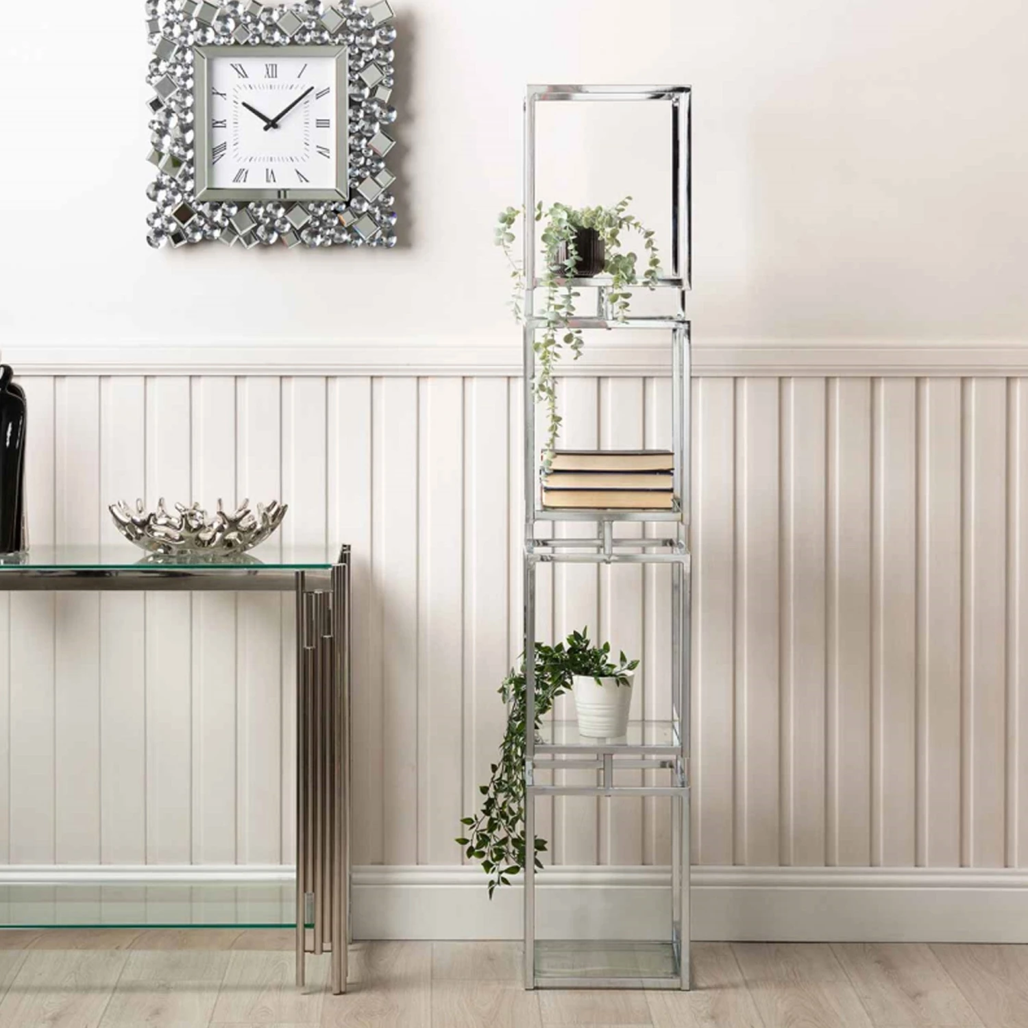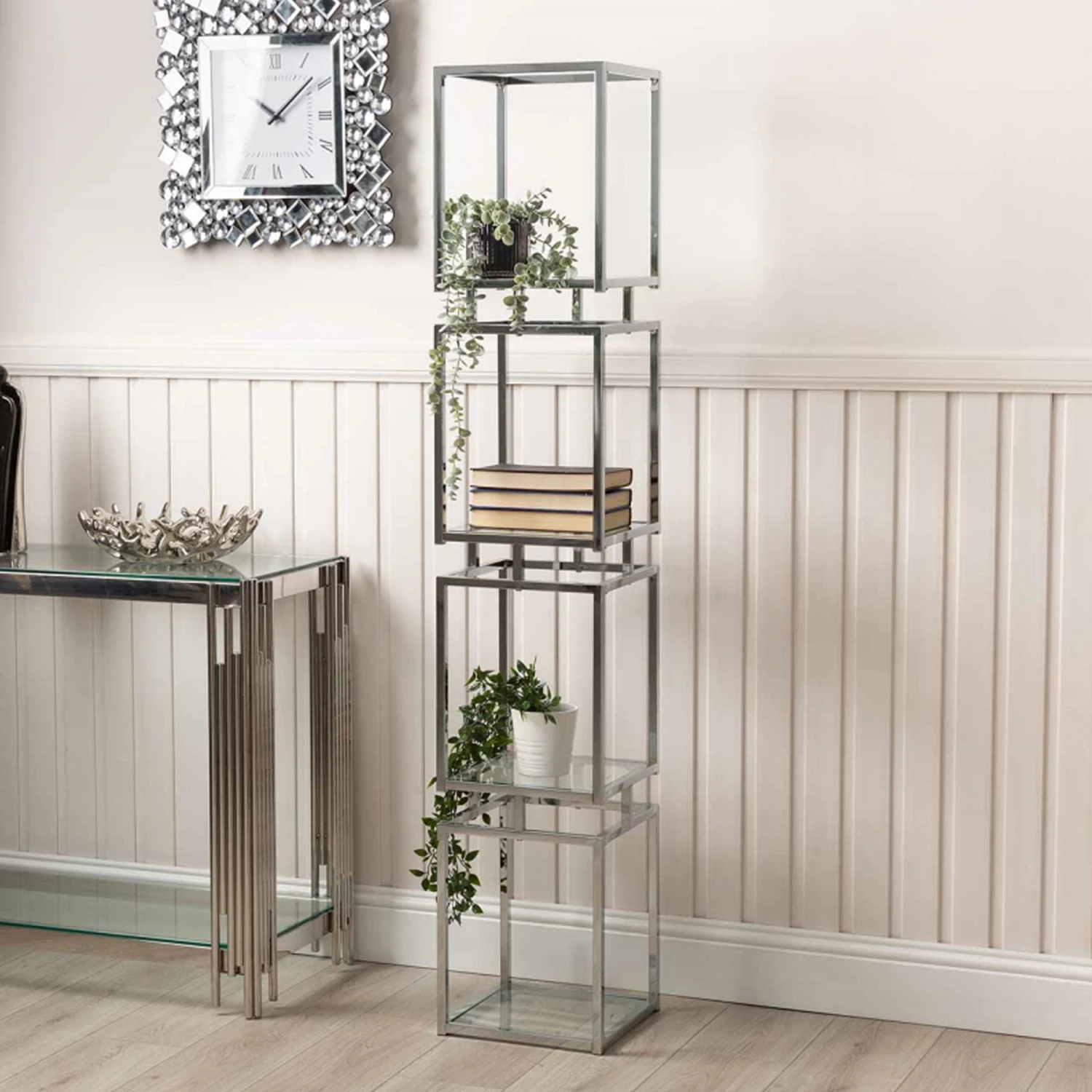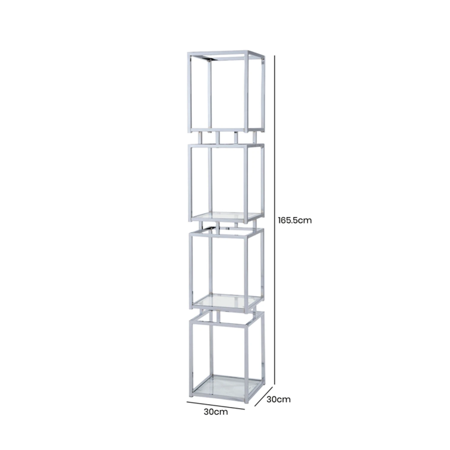 Display works of art, decorative ornaments, photo frames and much more on this Logan 165.5cm Chrome and Glass 4 Tiered Square Display Unit and bring your interior decor to life! Crafted with a stainless steel frame in a silver chrome finish, it has a 4 tiered design with tempered glass shelves, making it a modern display unit that will certainly impress when filled.
