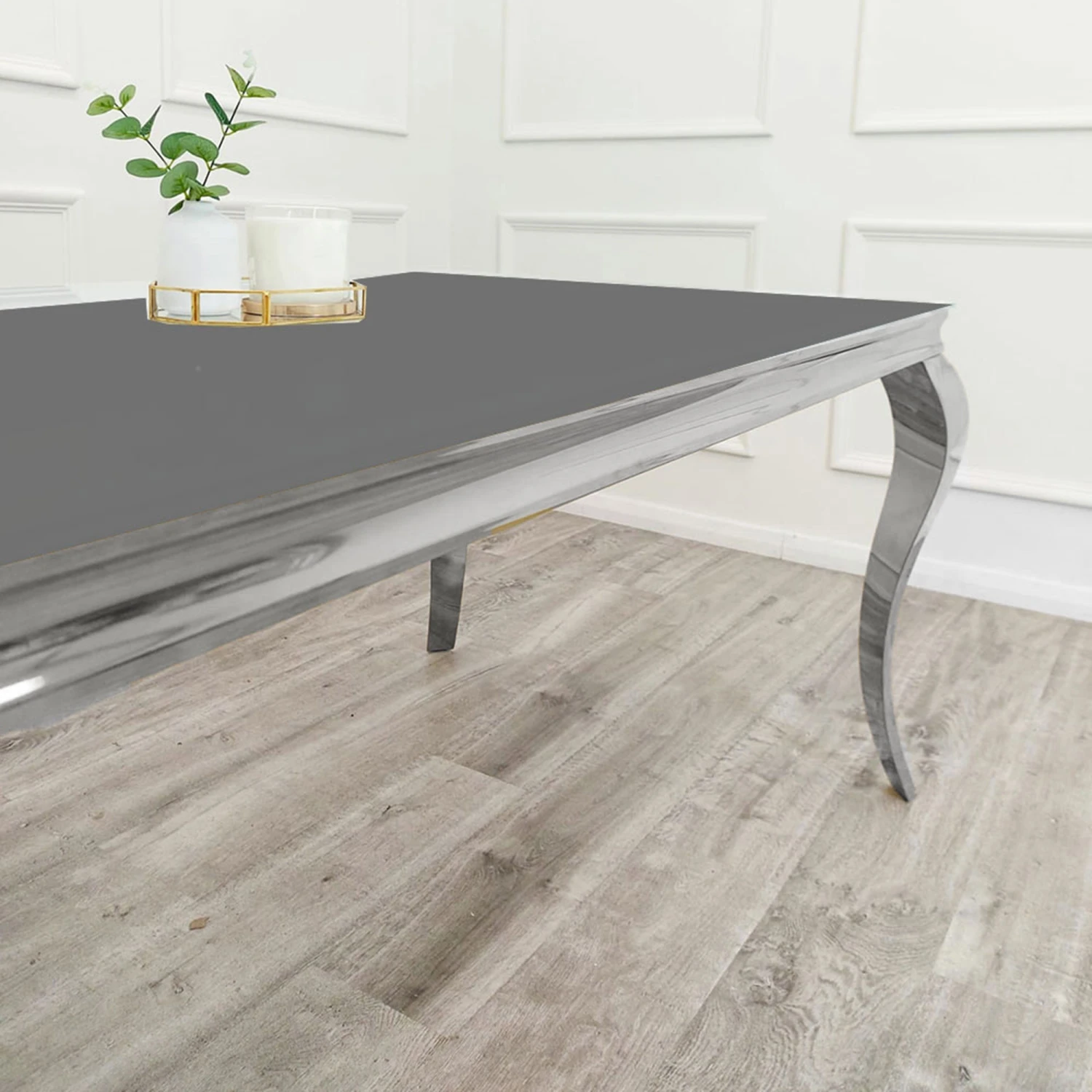 This Louis Chrome 2m Dining Table with Grey Glass Top will give your dining room a contemporary Parisian Chic style. The table is topped with sleek grey glass that is hardwearing and scratch resistant with a chrome base giving minimalist glamour. The base comes with fancy curved legs and a decorative trim around the table edge. The dining table is the epitome of luxury, style with other matching item for a uniform look in your home.