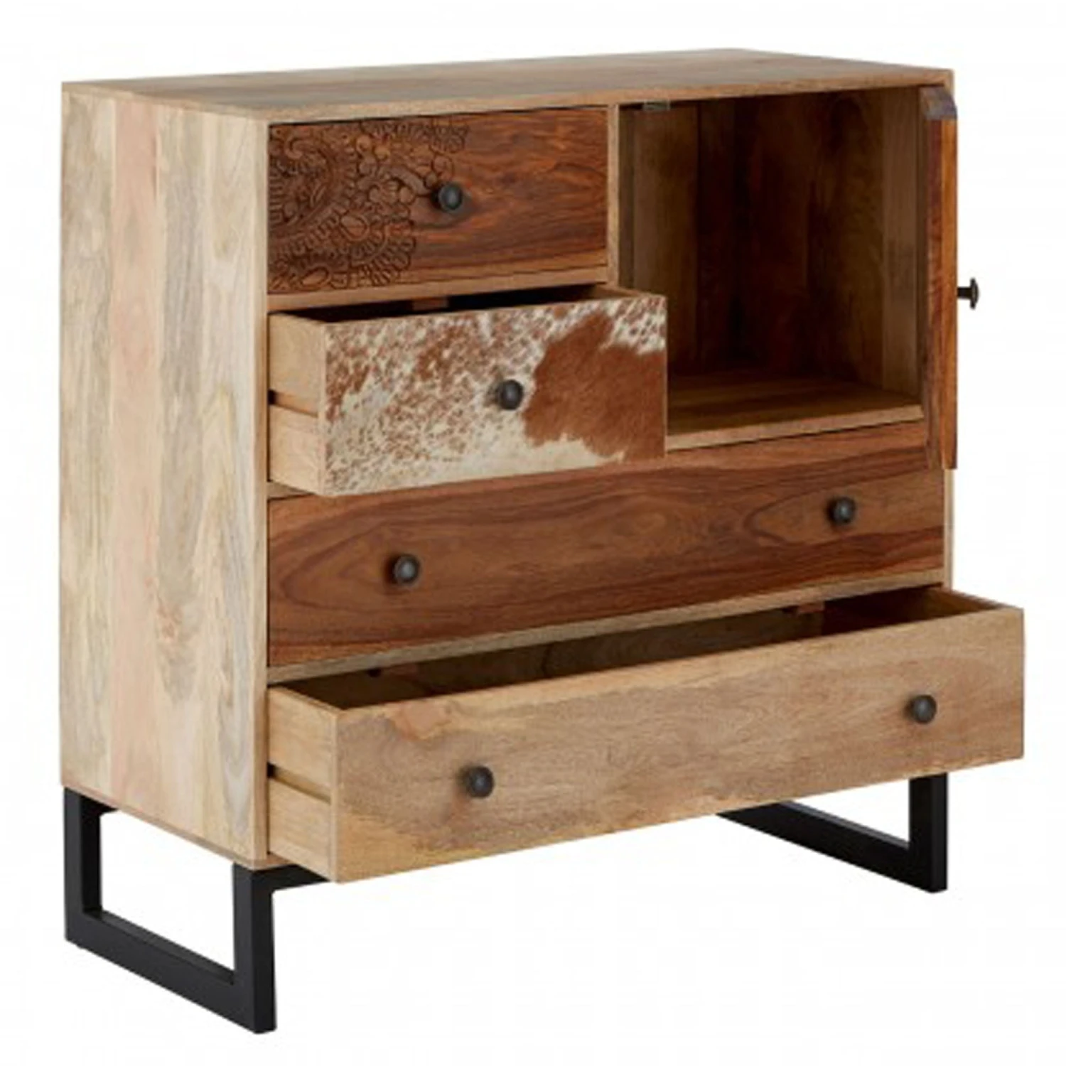 Introducing the Marwar Sideboard. This stunning piece is crafted from mango wood and has mismatching drawers which creates a boho/traveller feel. The mango wood is complemented by supple, genuine leather which is patterned to contrast the natural wood markings of the piece. This rests on metal legs with a black finish.