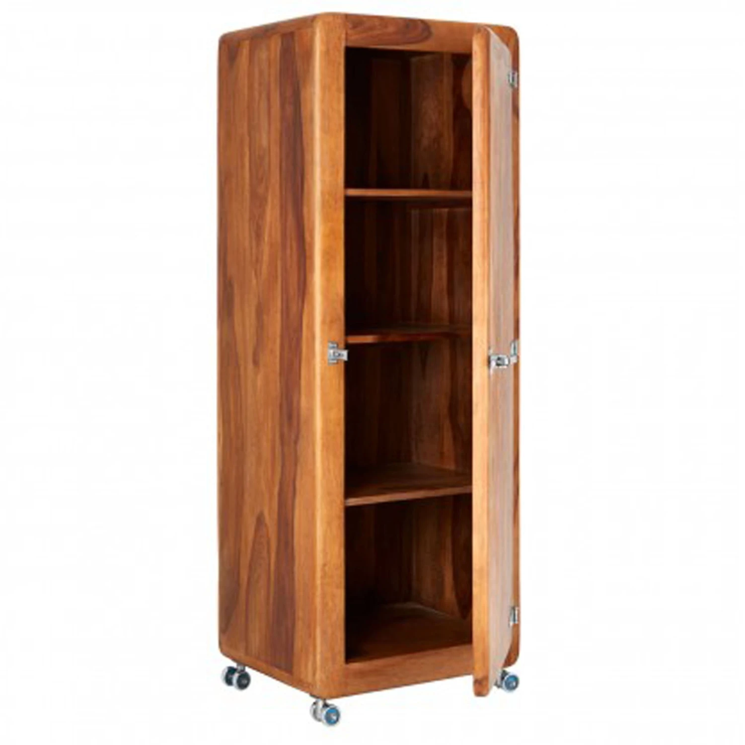 Introducing the Marwar Tall Cabinet. This stunning cabinet uses manmade and natural materials to form an exquisite and modern piece. The cabinet is crafted from mango wood and boasts waving natural wood markings throughout. The cabinet door conceals 4 tiers of storage for practicality and is fitted using contrasting, silver fittings. The cabinet is on silver wheels to add a modern edge.
