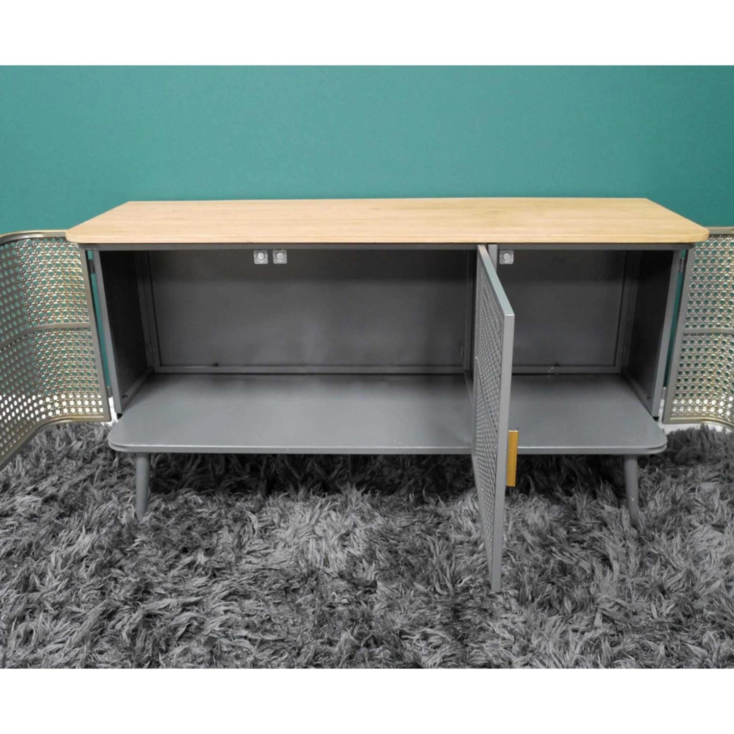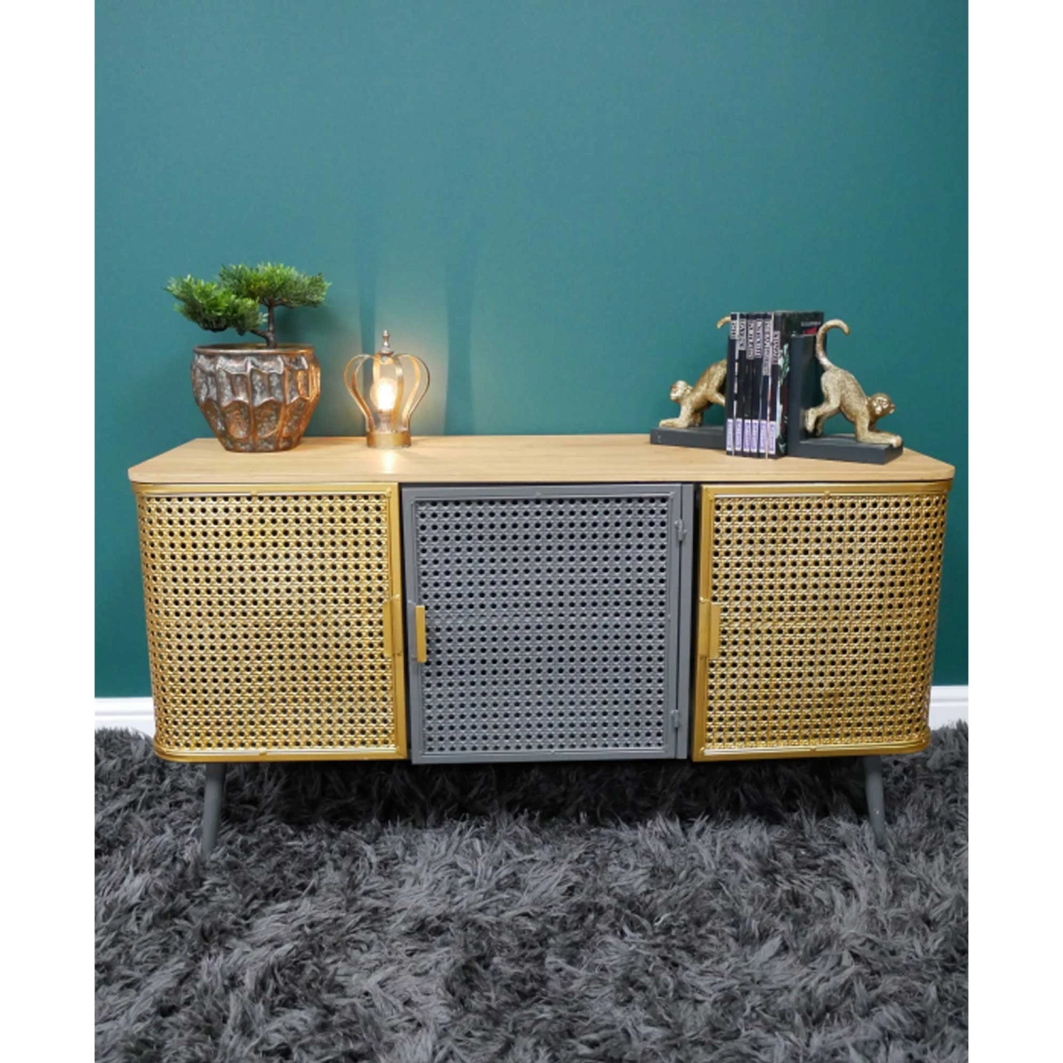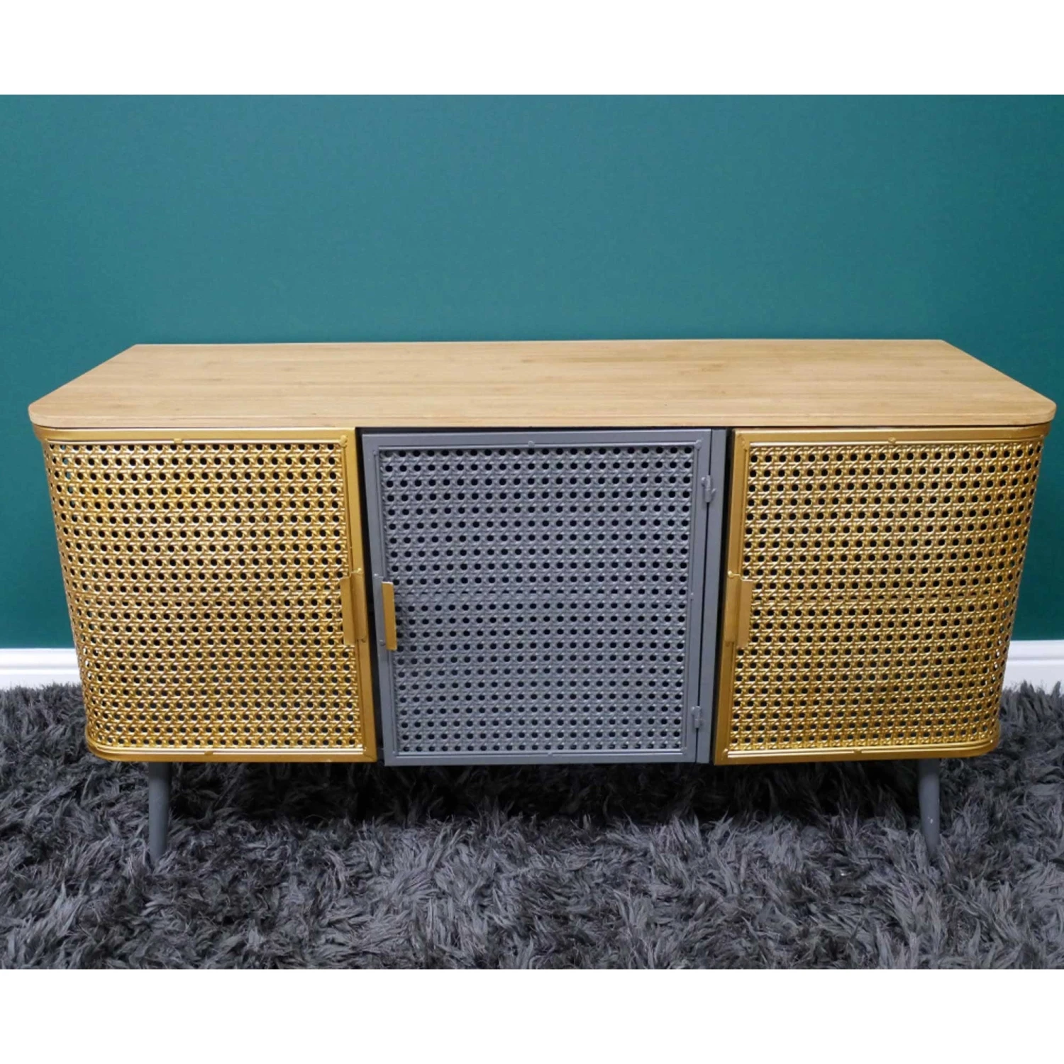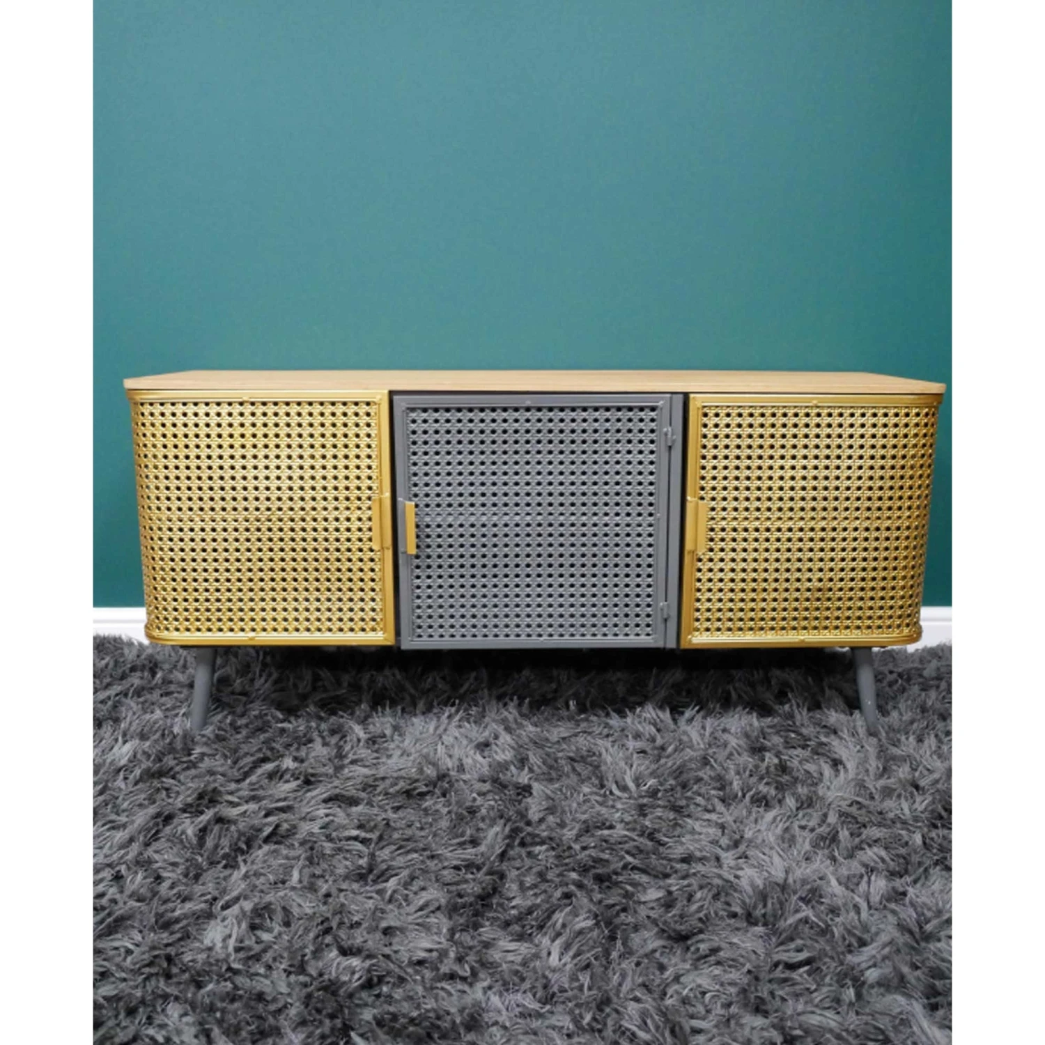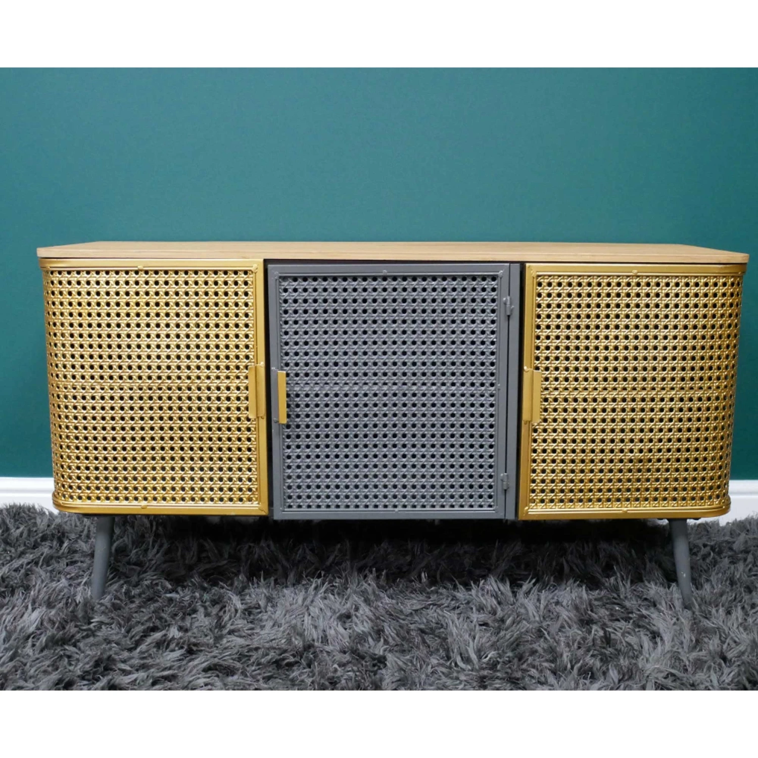 A great choice for industrial inspired homes, this Meshed Metal Low Sideboard is perfect for providing additional storage space. Suited to a living room, dining room or hallway, it’s versatile and practical for many different uses in the home. Crafted from solid metal for a long-lasting build, it comes in a grey and yellow contrasting finish with 3 doors that open out for all your storage needs. Complete with a wooden top, it’s a rustic designed sideboard that will be a striking piece in the home.