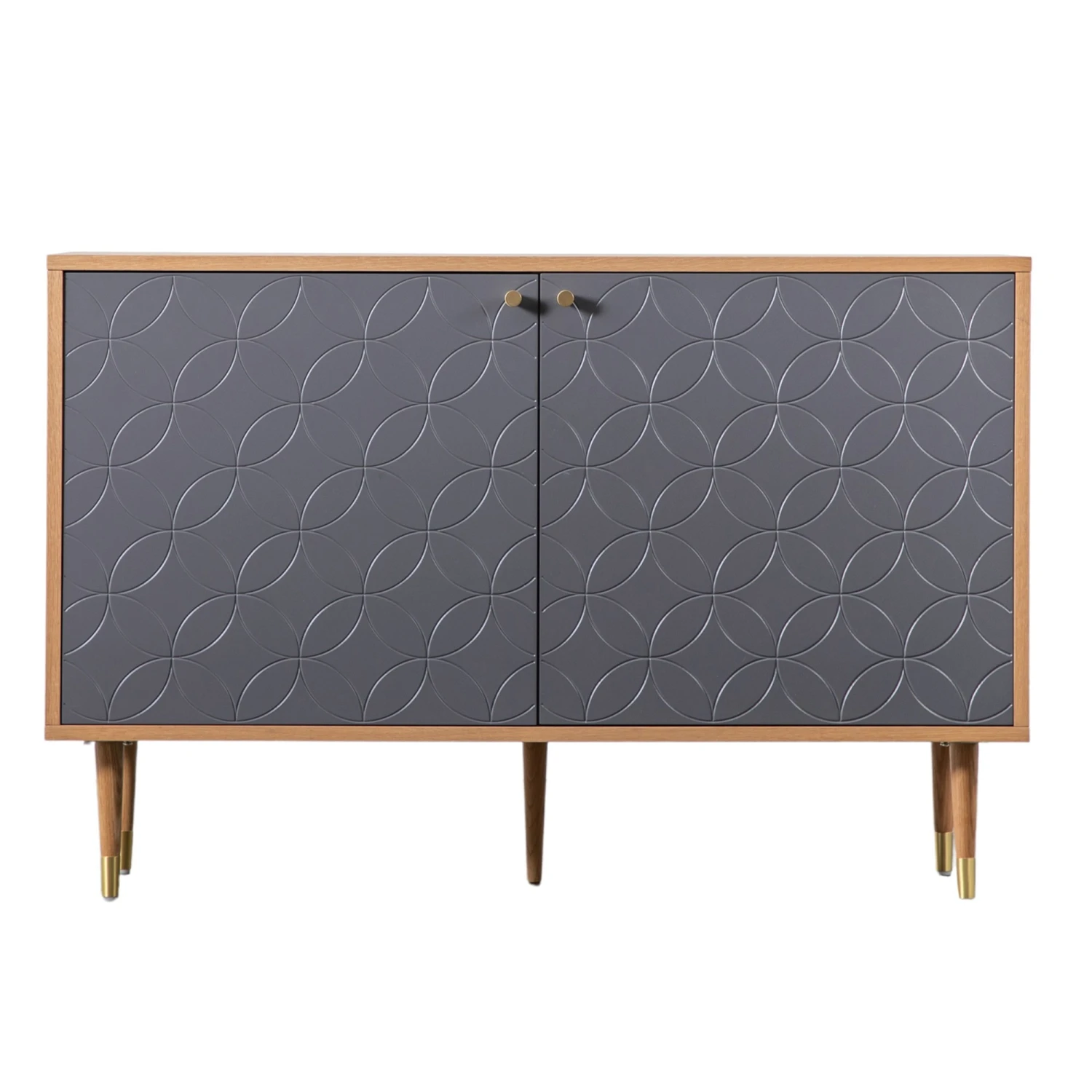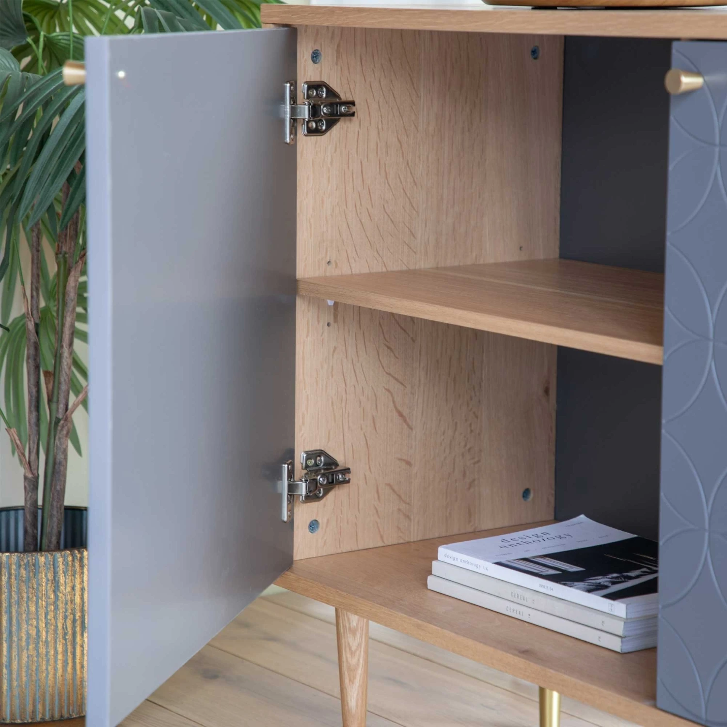 In need of a place to store your household items to keep your home neat and tidy? Discover the Newbury Grey Oak 2 Door Cabinet, featuring a lovely contemporary design that boasts a geometric circular pattern on its 2 door design. Split up internally by a central shelf, it provides plenty of spacious storage that allows you to re-organise your home better. In a natural oak finish, the door fronts are painted in a lovely light grey shade, and it comes manufactured from solid oak wood and MDF. Complete with simple brass detailing and brass handles, it’s an impressive piece you don’t want to miss out on!