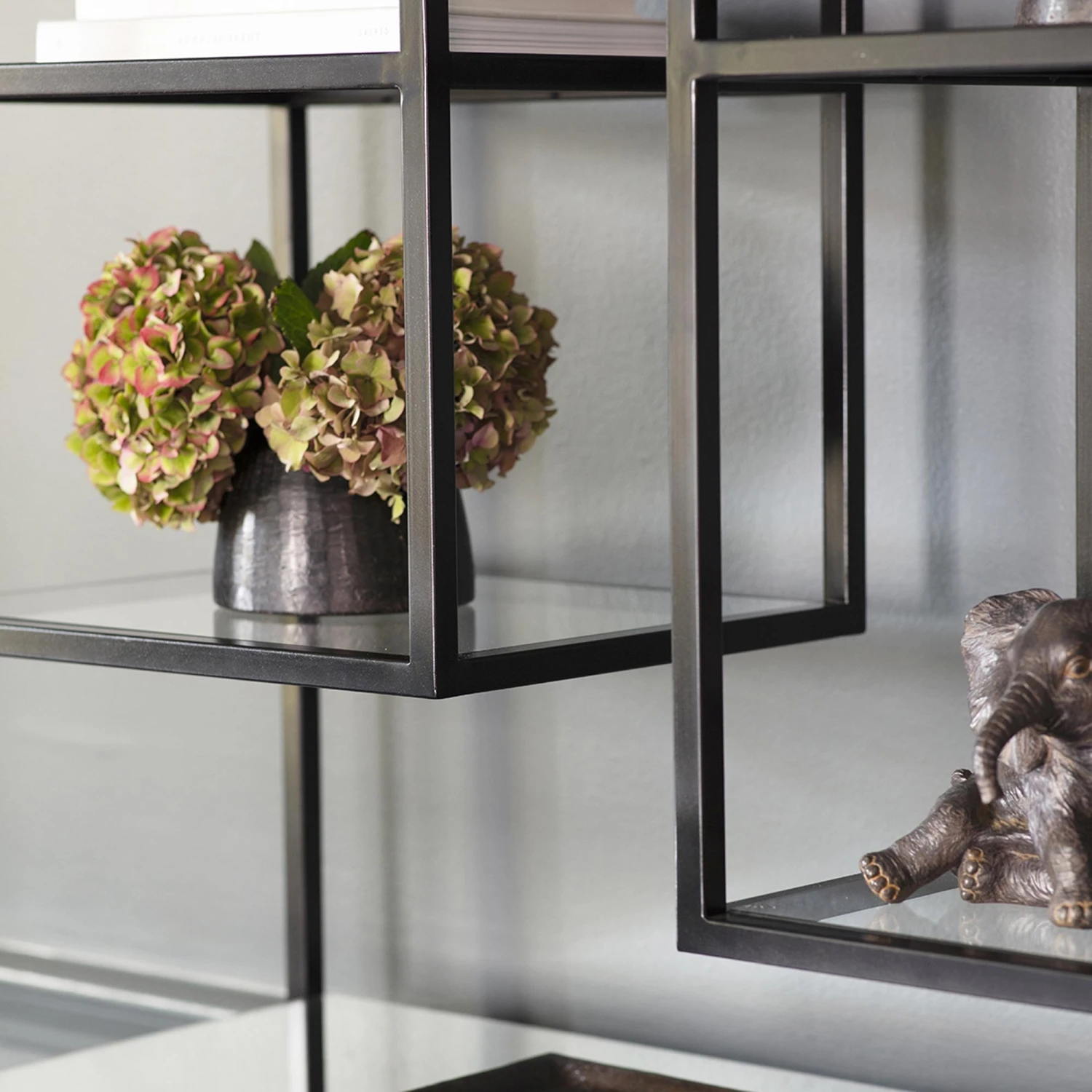 Introducing our new Pippard Range, The Open Display Unit in Black features beautiful mirror shelves all set within a stylish matte black metal frame. The Frame features six off set tempered mirror styling shelves and one main shelf in bevelled mirror for the ultimate modern piece. Bring your room to life with this striking cabinet and co-ordinating items.