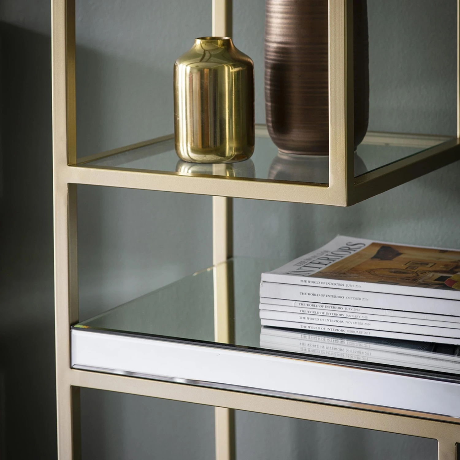 Introducing our new Pippard Range, The Open Display Unit in Champagne features beautiful mirror shelves all set within a stylish soft champagne metal frame. The Frame features six off set tempered mirror styling shelves and one main shelf in bevelled mirror for the ultimate modern piece. Bring your room to life with this striking cabinet and co-coordinating items.