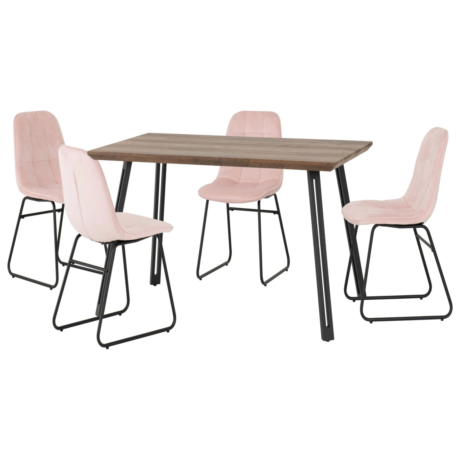 Switch up your dining furniture with this beautiful Quebec Medium Oak Straight Edge Dining Set with Baby Pink Lukas Chairs. Boasting a contemporary design, it provides enough space to seat 4 people, ideal for small families. With a rectangular medium oak finished table on a black metal frame, complete with 4 baby pink velvet chairs, its high quality design will make it a staple set of furniture that will brighten, whilst providing a comfortable and stylish dining experience for you and your guests. Durably built to be long-lasting using high quality materials, you will not be disappointed with its slightly rustic, yet modern appearance.