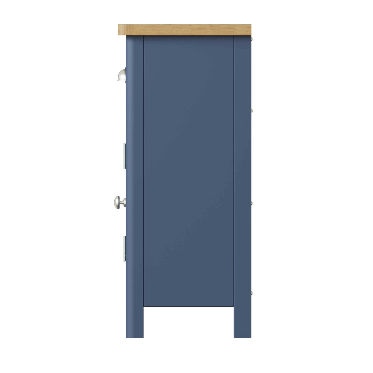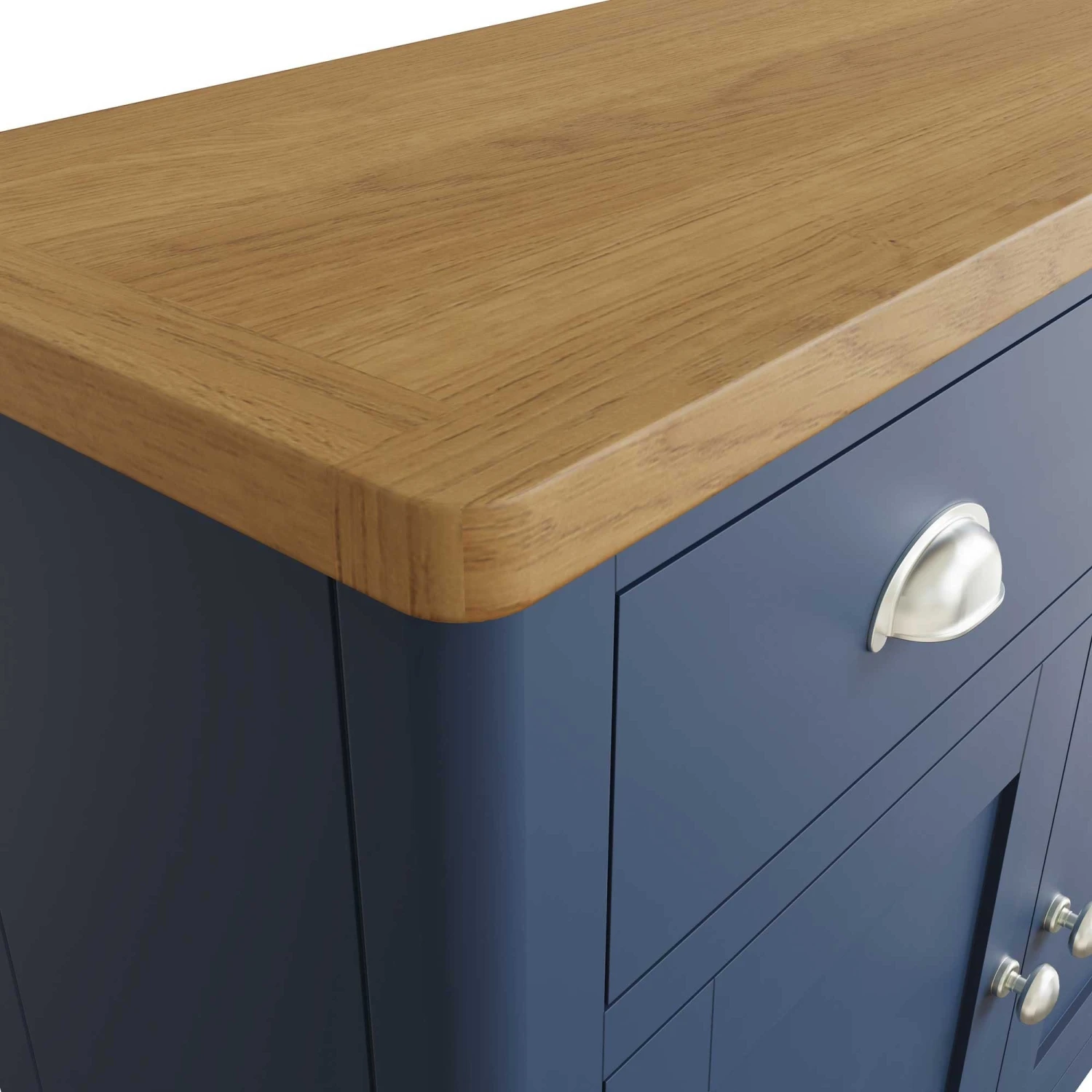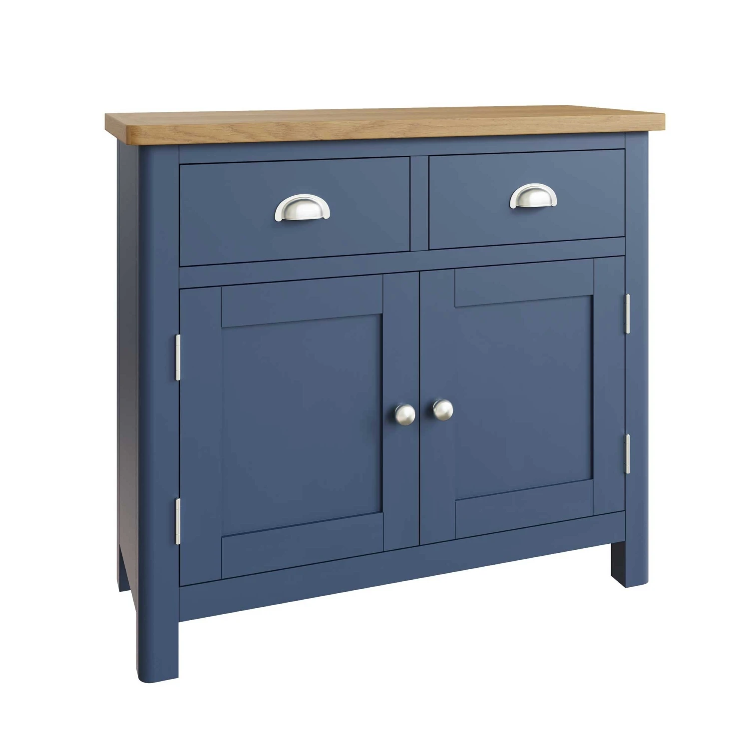 Increase the storage space in your dining room or lounge with this Ranston Blue 2 Door Sideboard. This beautiful sideboard features 2 doors and 2 drawers and is painted in a classic blue tone and finished with a contrasting thick oak top for a contemporary look. The soft rounded edges add a unique subtle touch to the home interior and the brushed steel handles bring elegance to the room. Matching items available.Â