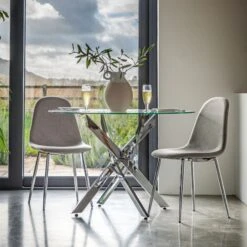 Quebec Medium Oak Wave Edge Dining Set With Grey Velvet Lukas Chairs