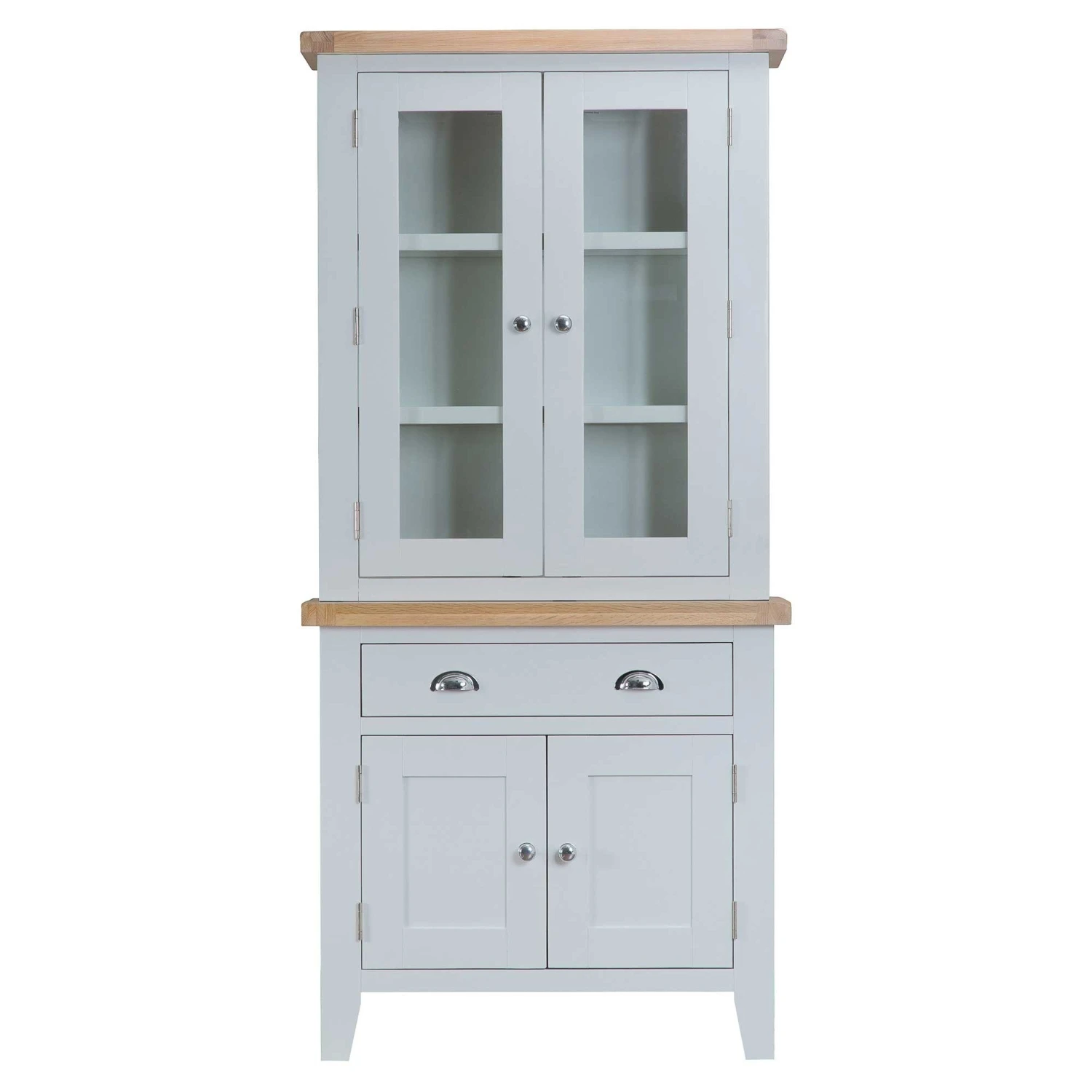 This Trentino Grey Small Hutch is perfect for adding to a sideboard in the dining room for extra storage facilities for your kitchenware. Crafted from oak wood, it has a beautiful painted grey finish and comes complete with 2 doors with glass panelled fronts with 2 interior shelves. Store your glasses, cups, and small side plates in this lovely dresser top to de-clutter your kitchen and create more space. For matching items, check out the rest of the Trentino Grey Dining Range and complete your dining furniture.