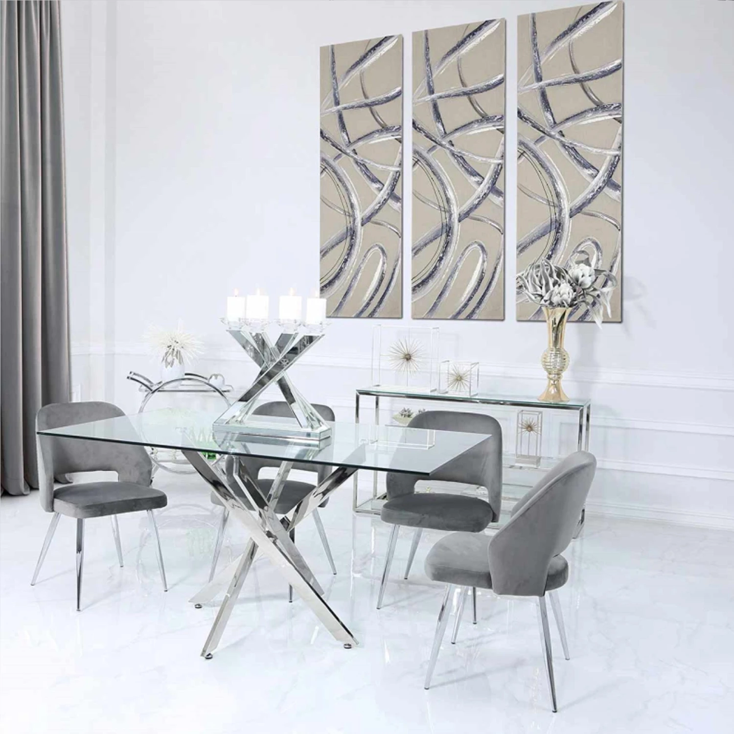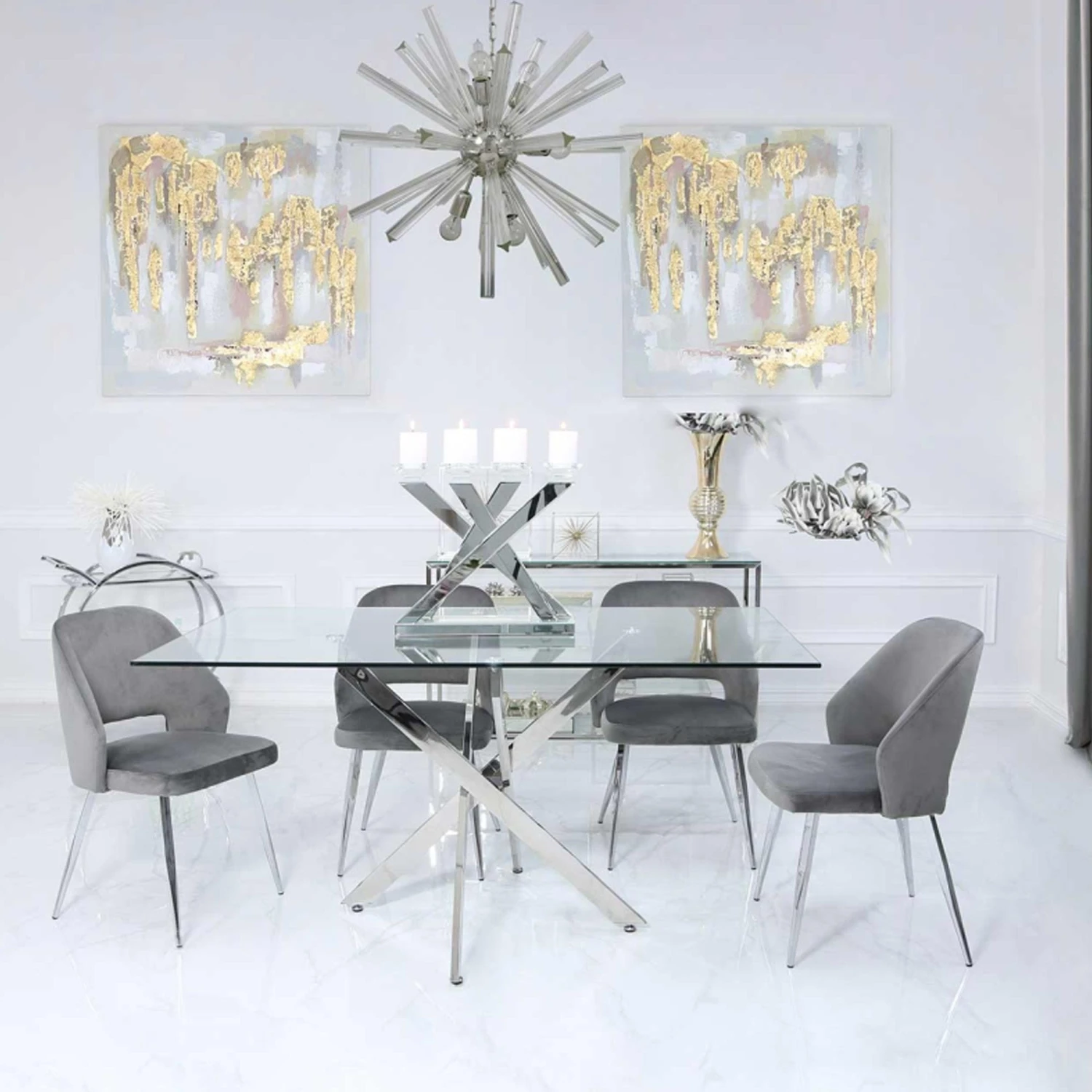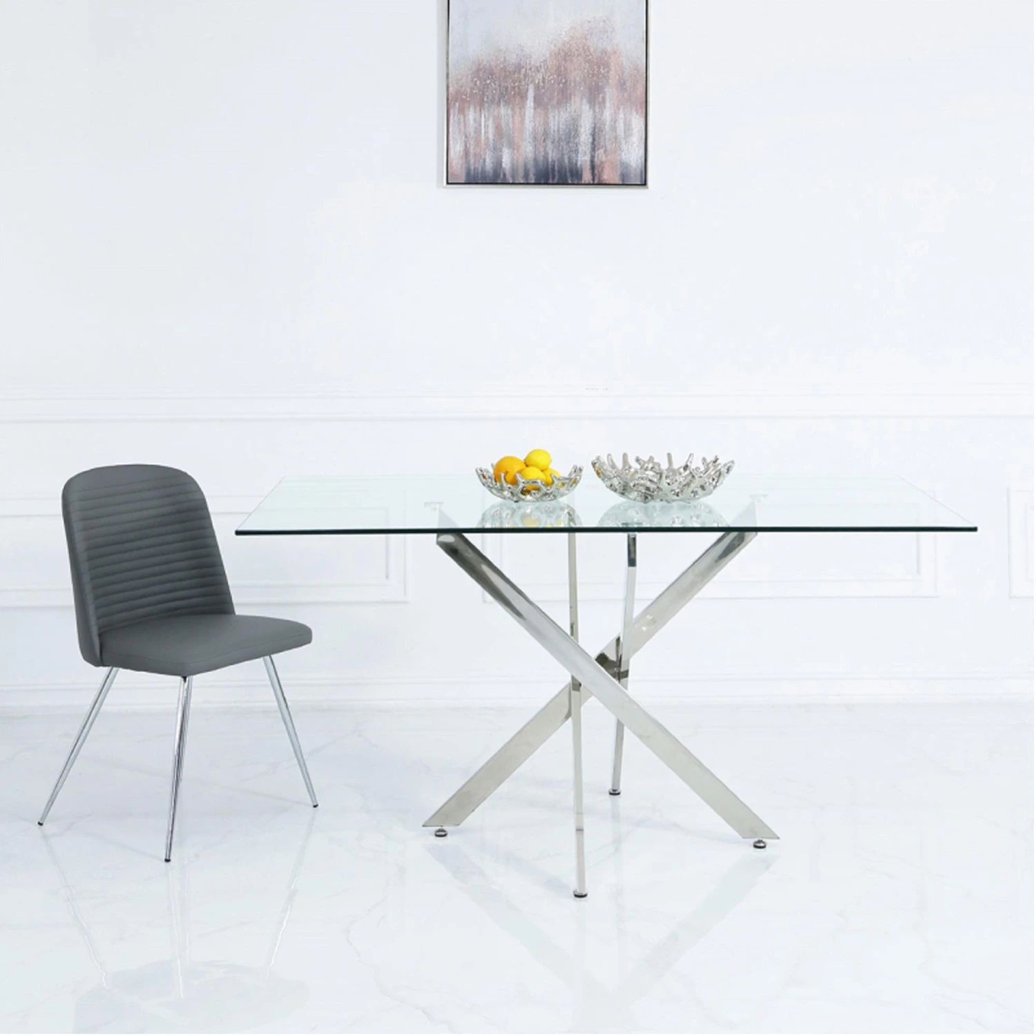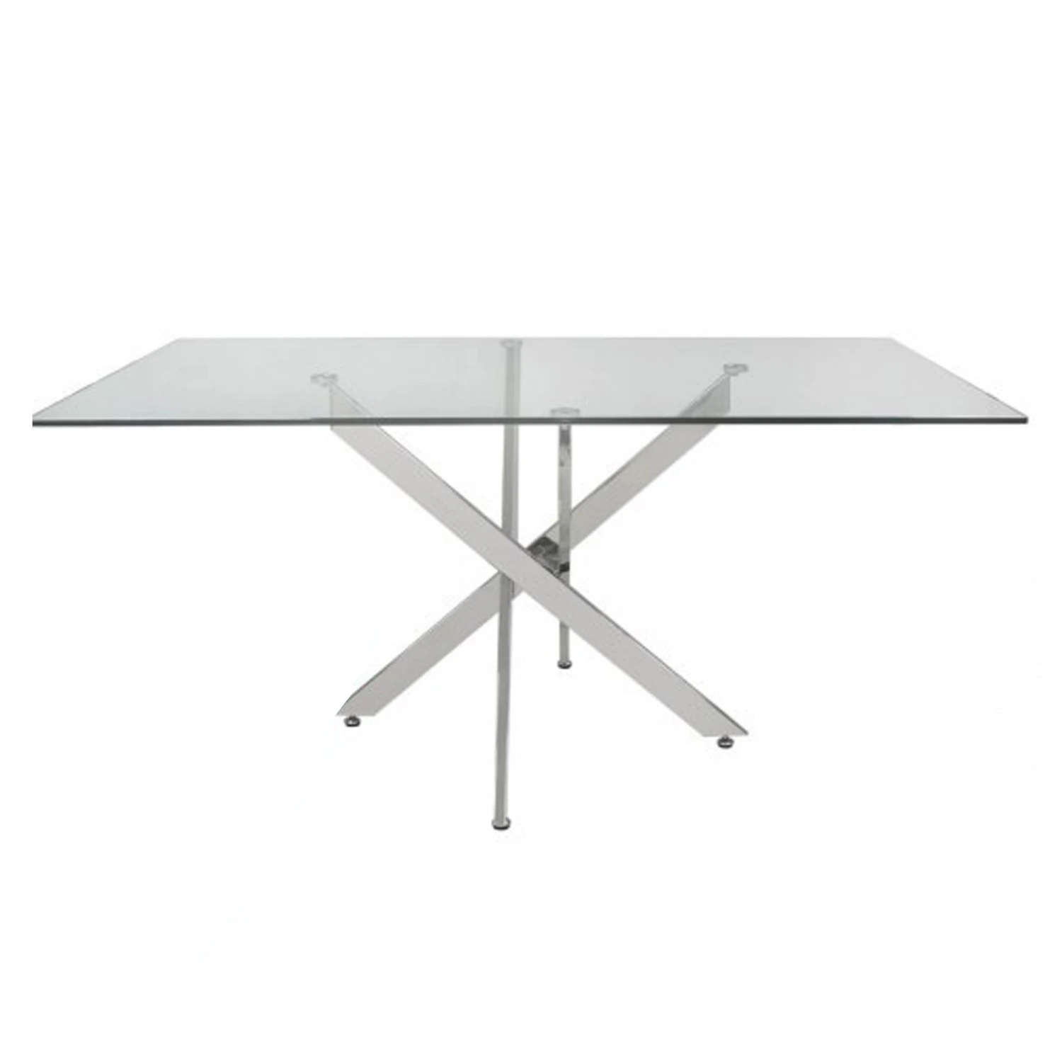 We are very proud to introduce the gorgeous Value Nova Rectangular Dining Table. This modern dining table has a stunning design that’ll be sure to impress, whilst acting as a practical and stylish piece for any home. The rectangular glass table top fits perfectly alongside the chrome crisscross base.
