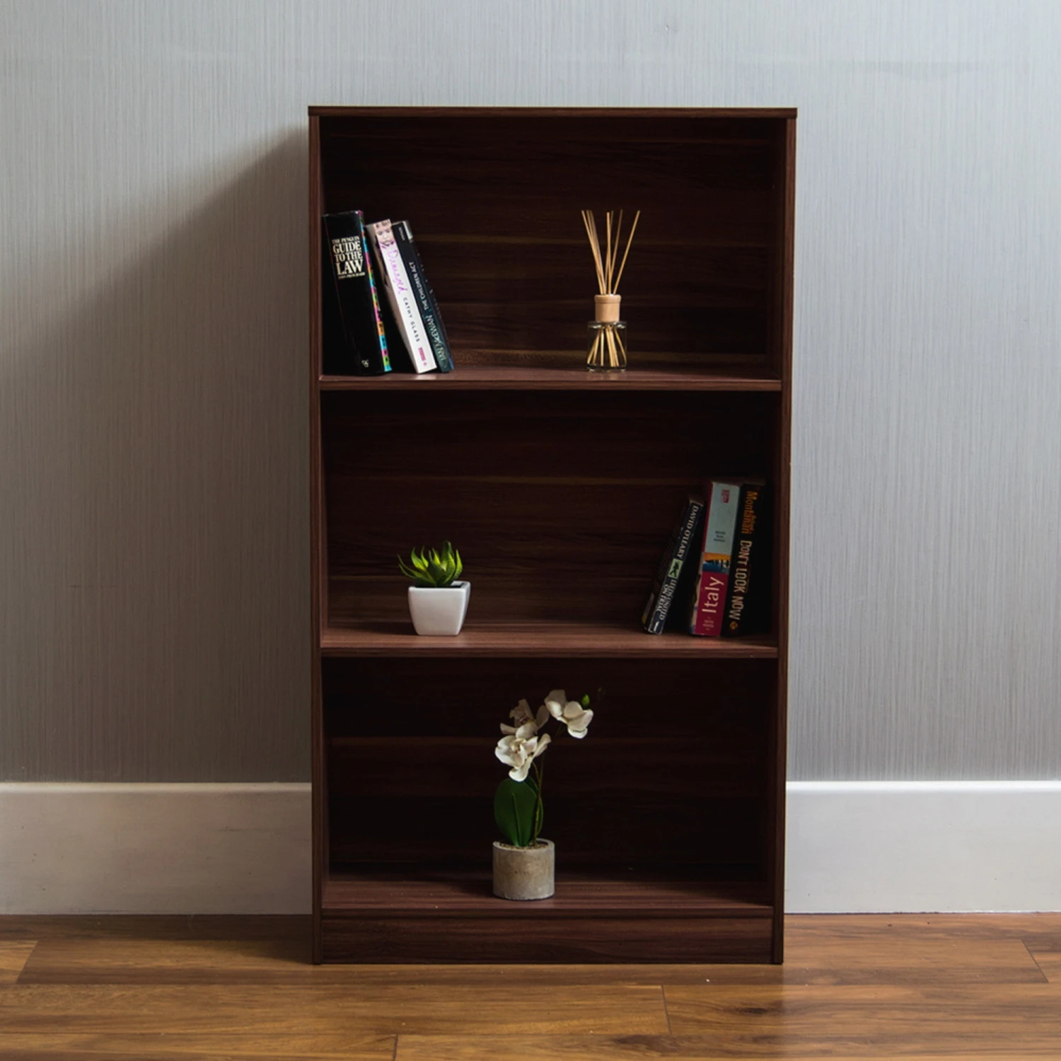 With a walnut finish, this 3 tier bookcase will do well to bring design and style to your home, regardless of the furniture you feature, you’ll want to make sure this bookcase is going to make for an elegant addition to your home by adding it to an interior scenario already featuring modern furniture.