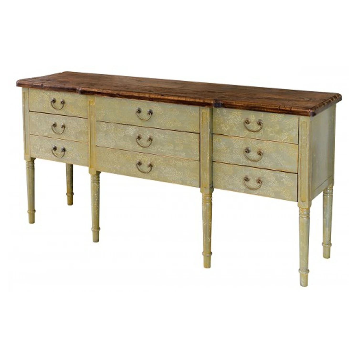 Introducing the newest addition to our collection of sideboards, this beautiful Wooden Nine Drawer Sideboard. A fabulous hand painted wooden sideboard unit in sage green with a white speckle effect. Decorated with ornate handles this sideboard has nine drawers and is painted black on the inside.