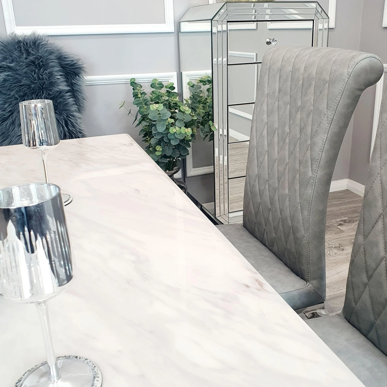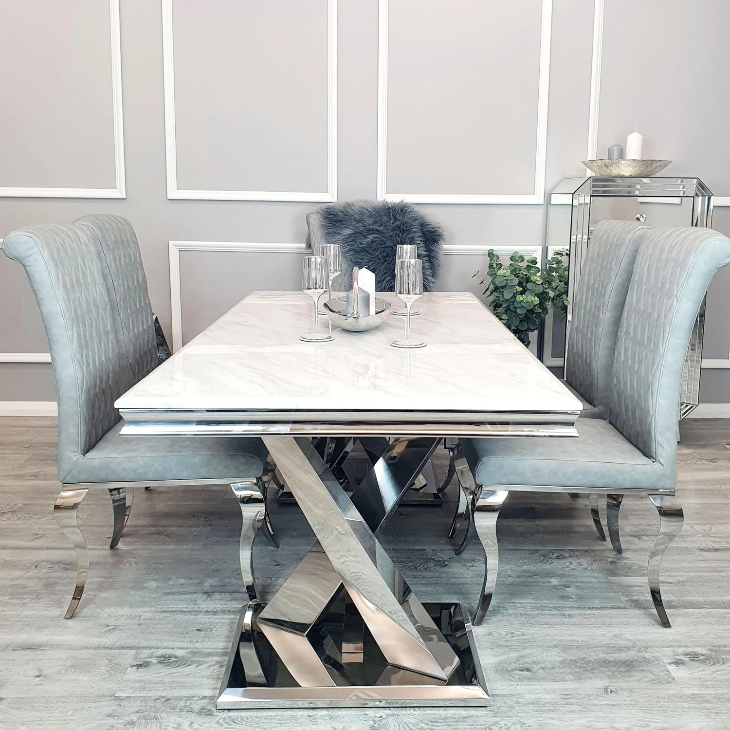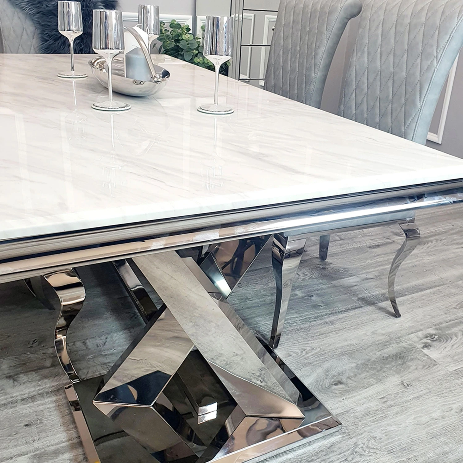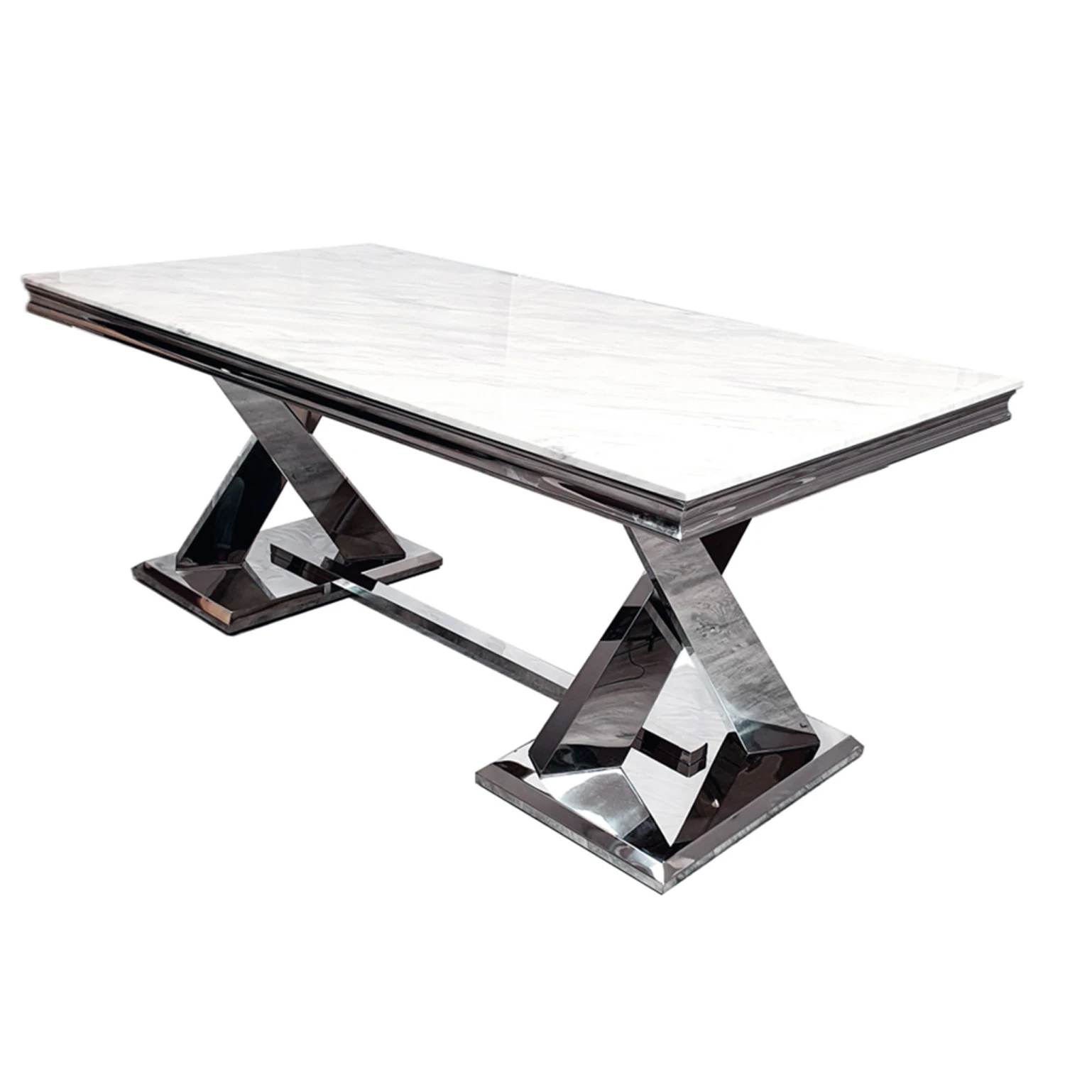 Bringing luxury and sophistication to your dining room with the stunning Xavia Polar White Sintered Stone 1.8 Dining Table. The table features a stunning white sintered stone top that sits on polished stainless steel double X shaped legs for the base. Display the dining table with your own choice of dining chairs to suit your interiors perfectly.